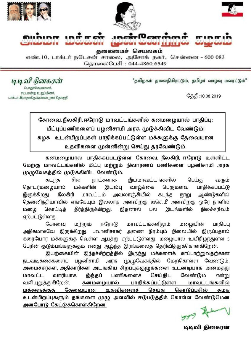 தமிழகத்தில் கனமழை பாதிக்கப்பட்டுள்ள கோவை, நீலகிரி, ஈரோடு மாவட்டங்களில் மீட்புப்பணிகளை எடப்பாடி அரசு துரிதப்படுத்த வேண்டும். மேலும் கழக உடன்பிறப்புகள் பாதிக்கப்பட்டுள்ள மக்களுக்கு தேவையான உதவிகளை முன்னின்று செய்து தரவேண்டும் என அமமுக பொதுச்செயலாளர் டிடிவி.தினகரன் உத்தரவிட்டுள்ளார்.