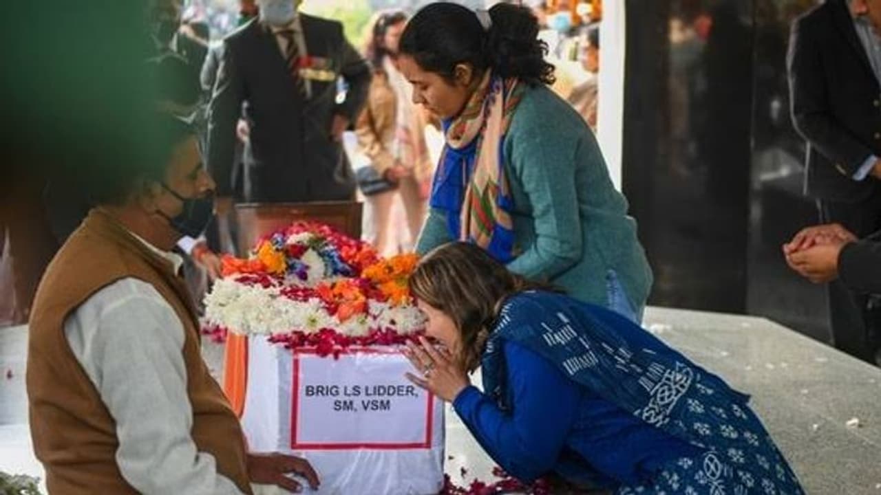 ஹெலிகாப்டர் விபத்தில் உயிரிழந்த துணிச்சலான ராணுவ அதிகாரி பிரிகேடியர் லக்விந்தர் சிங் லிடரின் உடல் பெரார் சதுக்கத்தில் உள்ள மயானத்தில் தகனம் செய்யப்பட்டது. மிகவும் உணர்ச்சிகரமான சூழ்நிலையில், பிரிகேடியரின் மனைவி கீதிகா மற்றும் மகள் ஆஷ்னா லிடர் ஆகியோர் கண்ணீர் மல்க அவருக்கு 'இறுதி அஞ்சலி செலுத்தி பிரியாவிடை கொடுத்தனர்.