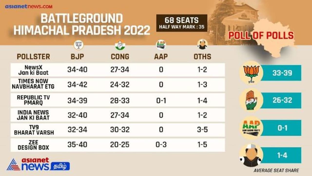 இமாச்சல பிரதேசத்தில் பாஜக ஆட்சியை பிடிக்கும் என்று டிவி9 குஜராத்தி , டைம்ஸ் நவ், நியூஸ் எக்ஸ் மற்றும் ரிபப்ளிக் டிவி, நடத்திய தேர்தலுக்கு பிந்தைய கருத்துக் கணிப்பில் தெரிய வந்துள்ளது. இருப்பினும் இழுபறியாக இருக்கும் என்றும் தெரியவந்துள்ளது.