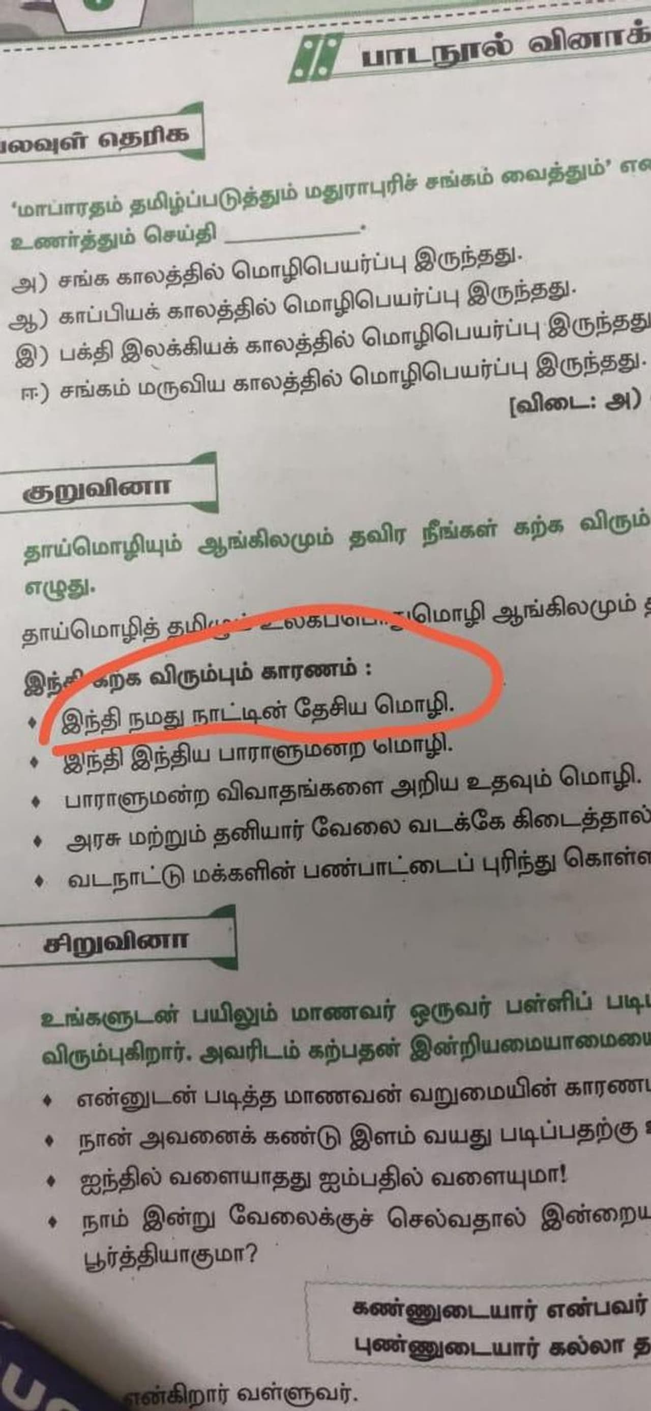 10-ம் வகுப்பு தமிழ் பாடத்தில் இந்தி திணிக்கப்பட்டுள்ளதாக வெளியான தகவல் தவறானது என்று கல்வித்துறை விளக்கமளித்துள்ளது. 6 முதல் 12-ம் வகுப்பு வரை பயிலும் மாணவர்களுக்கு ஆன்லைனிலும், கல்வித் தொலைக்காட்சி வாயிலாகவும் வகுப்புகள் நடைபெற்று வருகின்றன. அரசு, அரசு உதவி பெறும் பள்ளிகள், மெட்ரிக் பள்ளிகளில் மாநில அரசின் பாடத்திட்டத்தின் கீழ் வகுப்புகள் நடைபெற்று வருகிறது. இந்நிலையில், 10-ம் வகுப்பு தமிழ் பாட புத்தகத்தில், 5-ம் இயல் பிரிவில், திறன் அறிவோம் பகுதியில் குறுவினா ஒன்றில், "இந்தி கற்க விரும்பும் காரணம்" என்று குறிப்பிட்டு, அதற்கான காரணங்களை பட்டியலிட்டு, சில புகைப்படங்கள் சமூக வலைதளங்களில் பரவியது.