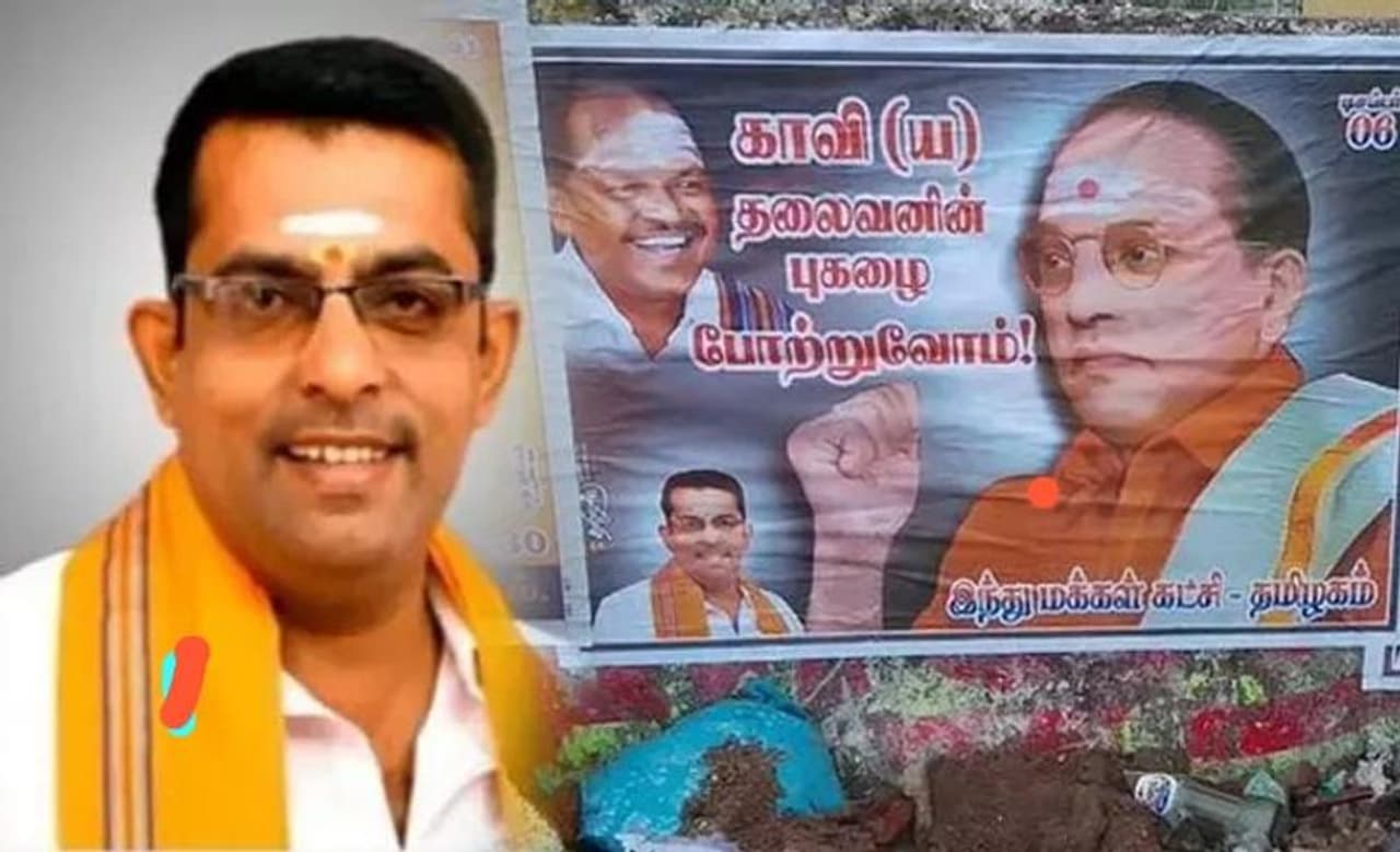 அர்ஜூன் சம்பத் உயர்நீதிமன்றத்தில் நேற்று உத்தரவாதம் கடிதம் தாக்கல் செய்த நிலையில் தஞ்சை மாவட்டம் கும்பகோணத்தில் இந்து மக்கள் கட்சி சார்பில், அம்பேத்கர் உருவ படத்தில் காவி உடை அணிவித்து விபூதி பூசி, குங்குமம் வைத்து போஸ்டர் ஒட்டியிருந்தது பரபரப்பை ஏற்படுத்தியுள்ளது. அந்த போஸ்டரில் 'காவி(ய) தலைவனின் புகழை போற்றுவோம்' என பதிவு செய்யப்பட்டிருந்தது. இந்த போஸ்டருக்கு எதிர்ப்பு தெரிவித்து விடுதலை சிறுத்தைகள் உள்ளிட்ட பல்வேறு கட்சிகள் போராட்டத்தில் ஈடுபட்டன. இதனையடுத்து அந்த போஸ்டரை அகற்றிய போலீசார் அம்பேத்கர் உருவப்படத்திற்கு காவி உடை, விபூதி, குங்குமம் வைக்கப்பட்டு போஸ்டர் ஒட்டப்பட்டது தொடர்பாக கும்பகோணத்தை சேர்ந்த இந்து மக்கள் கட்சி மாநில பொதுச்செயலாளர் குருமூர்த்தியை கைது செய்து சிறையில் அடைத்தனர்.