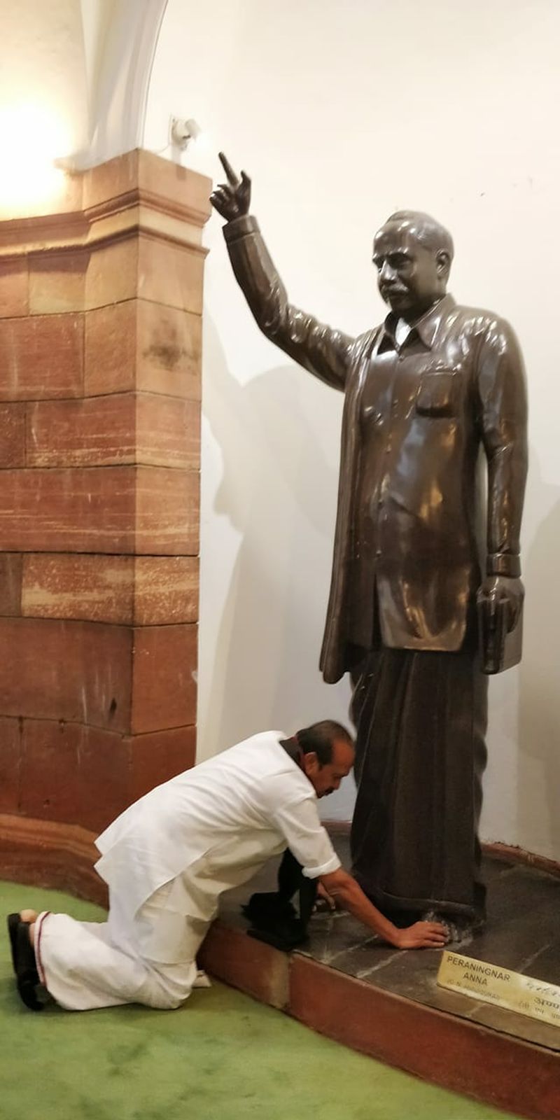 நாடாளுமன்றத்திற்கு திமுகவின் தயவில் 23 ஆண்டுகளுக்கு பிறகு வைகோ ராஜ்ய சபா எம்.பி.,யாக தேர்ந்தெடுக்கப்பட்டுள்ளார். இன்று பதவி பிரமாணம் எடுத்துக் கொள்வதற்காக டெல்லி சென்ற அவர் நாடாளுமன்றத்திற்கு உள்ளே சென்ற போது அங்குள்ள அறிஞர் அண்ணா சிலையை பார்த்ததும் சாஷ்டாங்கமாக தரையில் விழுந்து அண்ணா சிலையிம் காலடியை பிடித்து வணங்கினார்.