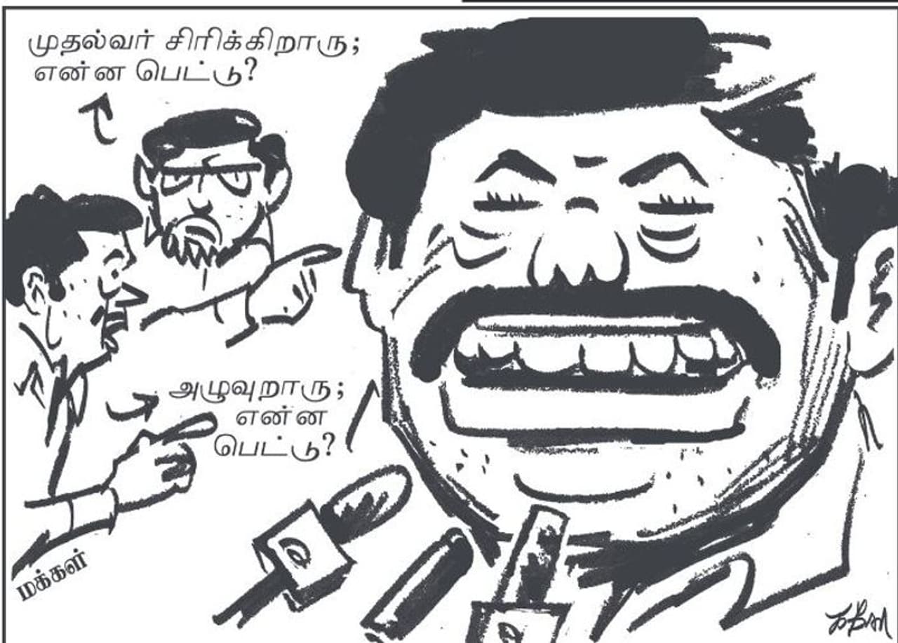முதல்வர் எடப்பாடி பழனிசாமி சிரிக்கிறாரா? அழுகிறாரா..? என திமுக நாளேடான முரசொலி கேலிச்சித்திரம் வரைந்து வெளியிட்டுள்ளது.