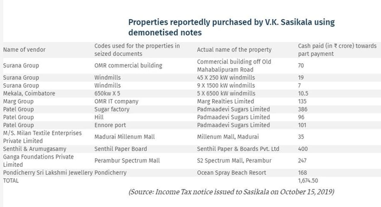 அந்த காகிதத்தை செல்போனில் படமெடுத்துவிட்டு அப்படியே விட்டுவிட்டுள்ளனர். சொத்து குவிப்பு வழக்கில் பரப்பன அக்ரஹார சிறைக்கு செல்வதற்கு முன்பு கிருஷ்ணபிரியா வீட்டில் சசிகலா தங்கியிருந்தபோது இந்த பரிவர்த்தனை நடந்தது தெரியவந்தது. அனைத்து தாள்களையும், கவர்களையும் அழித்த நிலையில் இரண்டு தாள்கள் மட்டும் வருமான வரித்துறையிடம் சிக்கியது. இதன் அடிப்படையில் வருமான வரித்துறை நடத்திய விசாரணையில், அந்த தாள்களில், செந்தில் என்பவர் எழுதியது தெரியவந்தது. அவரது வாக்குமூலத்தின்படி அந்த தாள்களில் உள்ளவை சசிகலா பண மதிப்பிழப்பு நேரத்தில் வாங்கிய ரூ1.674.50 கோடி சொத்துக்களின் விபரங்கள் என்று தெரியவந்தது. பான்ஜின் பான்ஹெர் நிறுவனத்தின் உரிமையாளருக்கு சொந்தமாக புதுச்சேரியில் லட்சுமி ஜூவல்லரி உள்ளது. மேலும் இவருக்கு சொந்தமாக புதுச்சேரியில் ஓசேன் ஸ்பிரே என்ற பெயரில் ரிசார்ட்டும் இருந்தது.