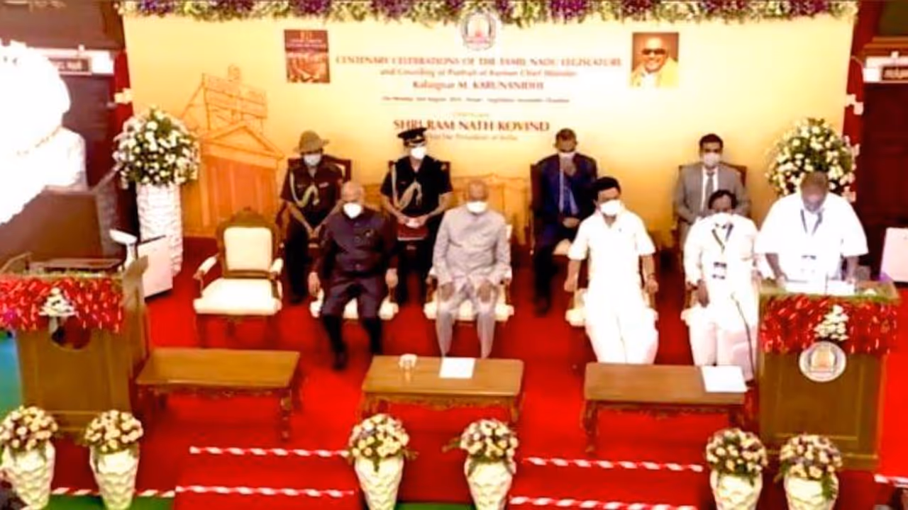 தமிழக சட்டமன்ற நூற்றாண்டு விழாவையொட்டி, முன்னாள் முதல்வர் கருணாநிதியின் திருவுருவப் படத்திறப்புவிழா இன்று நடைபெற்றது. இவ்விழாவில் குடியரசுத் தலைவர் ராம்நாத் கோவிந்த் கலந்துகொண்டு கருணாநிதியின் திருவுருவப் படத்தைத் திறந்து வைத்தார். தமிழக ஆளுநர் பன்வாரிலால் புரோஹித் இந்த நிகழ்ச்சியில் கலந்துகொண்டனர். அப்போது பேசிய முதலைச்சர் ஸ்டாலின்,