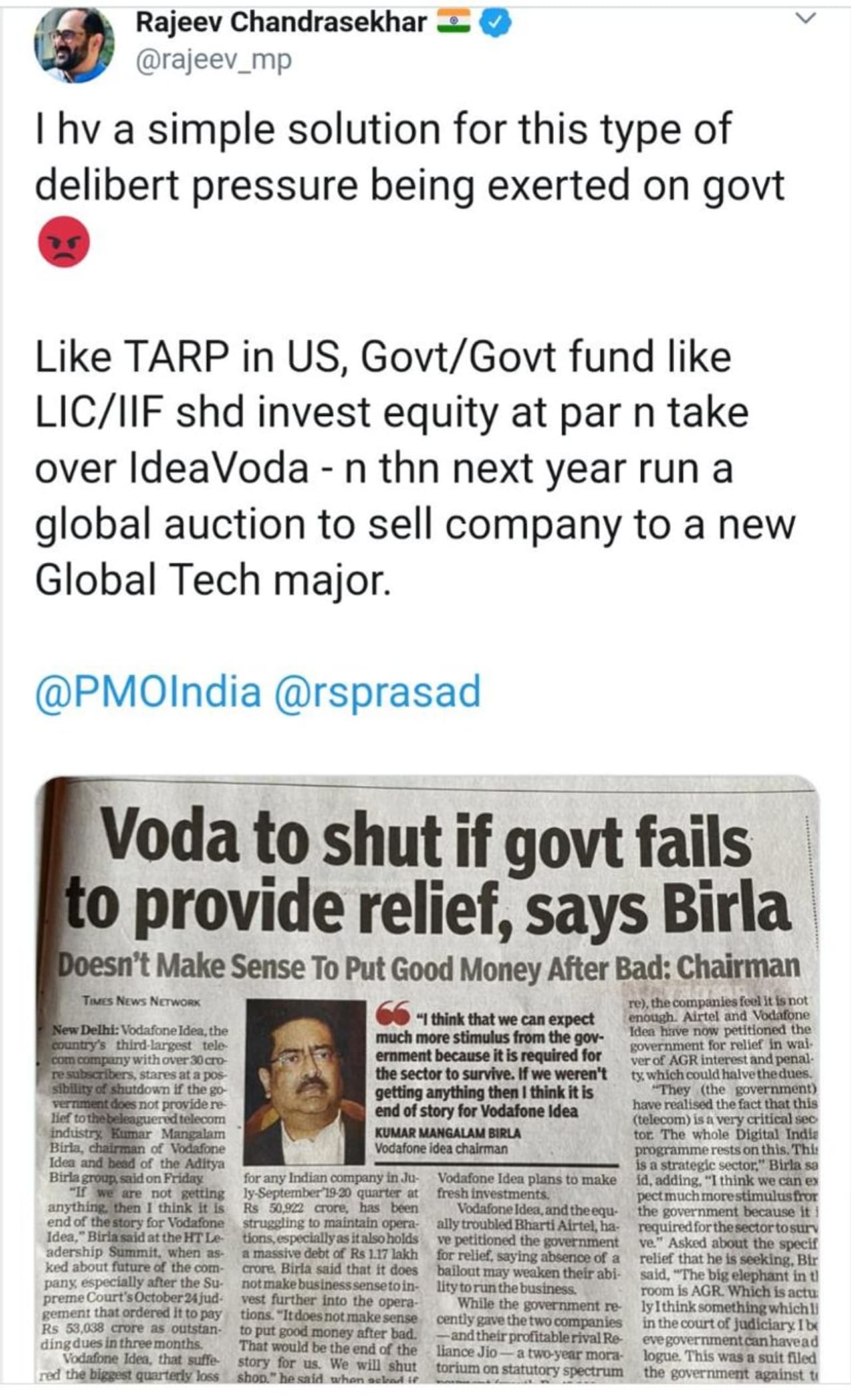இந்திய நெட்வொர்க் துறையை மீட்டெடுக்க வேண்டிய பொறுப்பு அரசுக்கு இருப்பதாகவும், அரசின் உதவி கண்டிப்பாகக் கிடைக்கும் எனவும் குமார் மங்களம் பிர்லா நம்பிக்கை தெரிவித்துள்ளார்.