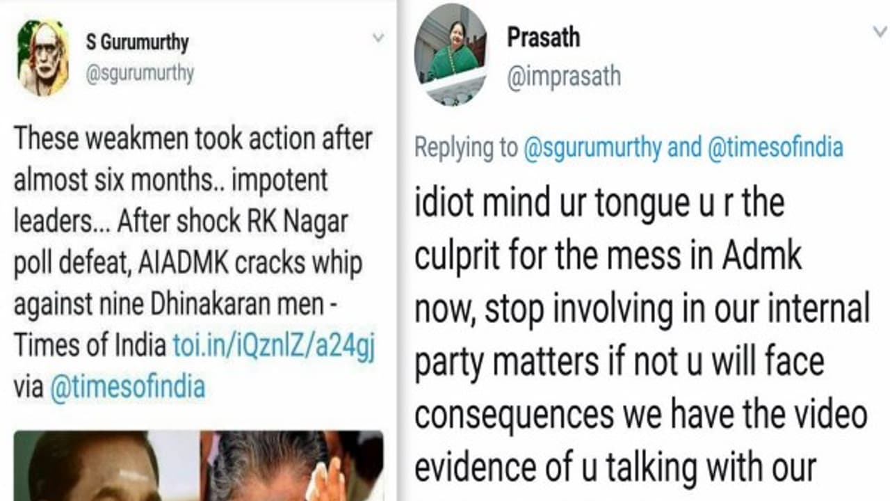 இதற்கு பதிலடி கொடுத்துள்ள அதிமுக IT Wing தலைவர், ஆடிட்டர் குருமூர்த்தியை முட்டாள் (Idiot) என்று சொல்லி "அதிமுகவின் இந்த நிலைக்கு ஆடிட்டர் குருமூர்த்தி தான் காரணம்" என்றும், அதிமுக உள்விவகாரங்களில் தலையீட்டால் அதிமுக அமைச்சர்களுடன் ஆடிட்டர் குருமூர்த்தி பேசிய வீடியோக்களை வெளியிடுவோம்" என்றும் மிரட்டியுள்ளார்.