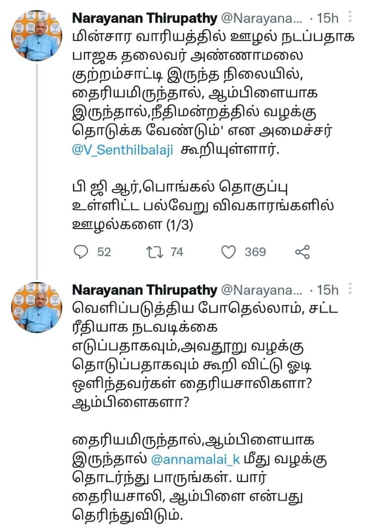 இருந்த போதும் திமுக- பாஜக இடையேயான மோதல் தொடர்ந்து கொண்டே இருந்தது. இதனையடுத்து முதலமைச்சர் குடும்பத்தோடு துபாய் பயணம், கர்ப்பினி பெண்களுக்கு ஊட்டசத்து, ஆகியவற்றை விமர்சித்து இருந்தது. இதற்கு எதிர்ப்பு தெரிவித்த திமுக அண்ணாமலை மீது 630 கோடி ரூபாய்க்கு மான நஷ்ட ஈடு கேட்டு நோட்டீஸ் அனுப்பியுள்ளது. இந்தநிலையில் பாஜக மாநில துணை தலைவர் நாரயணன் திருப்பதி வெளியிட்டுள்ள டுவிட்டர் பதிவில், மின்சார வாரியத்தில் ஊழல் நடப்பதாக பாஜக தலைவர் அண்ணாமலை குற்றம்சாட்டி இருந்த நிலையில், தைரியமிருந்தால், ஆம்பிளையாக இருந்தால்,நீதிமன்றத்தில் வழக்கு தொடுக்க வேண்டும்' என அமைச்சர் செந்தில் பாலாஜி கூறியுள்ளார்.