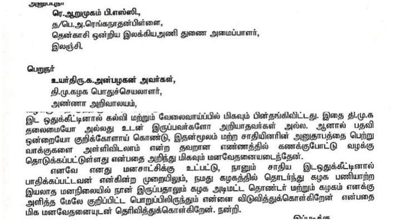 மத்திய அரசு மேற்பட்ட சாதியனருக்கு 10% இடஒதுக்கீட்டை நாடாளுமன்ற இரு அவைகளிலும் நிறைவேற்றியது. இதற்கு எதிர்ப்புத் தெரிவித்து திமுக சார்பில் வழக்குத் தொடரப்பட்டுள்ளது. திமுகவின் இந்த செயல்பாட்டுக்கு அக்கட்சியினரே எதிர்ப்புத் தெரிவித்து புதிய குடைச்சலை ஏற்படுத்தி வருகிறது. இதனால் திமுகவை விட்டு பலரும் வெளியேறி வருகின்றனர். இந்நிலையில், சமீபத்தில் கட்சியை விட்டு வெளியேறினார் தென்காசி ஒன்றிய இலக்கிய அணி துணை அமைப்பாளரான ஆறுமுகம். பதவி ஒன்றையே குறிக்கோளாய் கொண்டு அதன் மூலம் மற்ற சாதியினரின் அனுதாபத்தை பெற்று வாக்குகளை அள்ளிவிடலாம் என்ற தவறான எண்ணத்தில் கணக்குபோட்டு வழக்குத் தொடுக்கப்பட்டுள்ளது என்பதை அறிந்து மிகவும் மனம் வேதனை அடைவதால் கட்சியில் இருந்து விலகுவதாக அவர் கூறினார்.