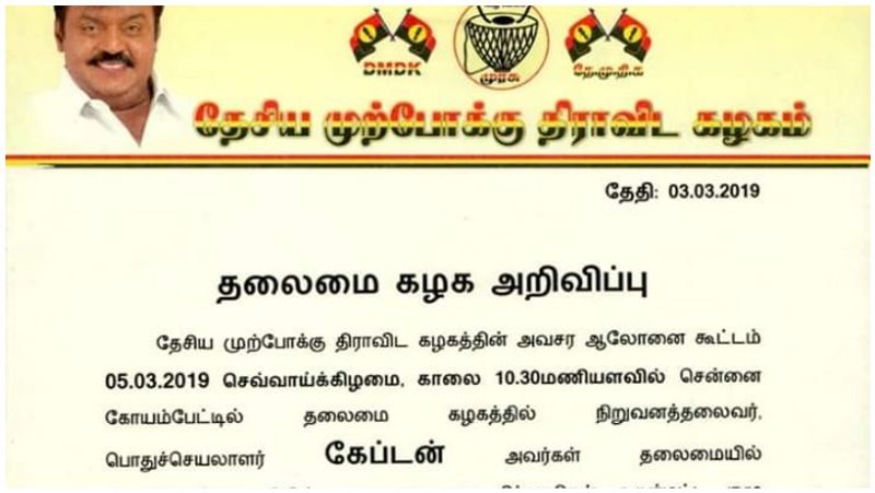 மக்களவை தேர்தலில் அதிமுக கூட்டணியில் இணைவது குறித்து முடிவெடுக்க வரும் 5ம் தேதி முக்கிய நிர்வாகிகளுக்கு தேமுதிக தலைவர் விஜயகாந்த் அழைப்பு விடுத்துள்ளார்.