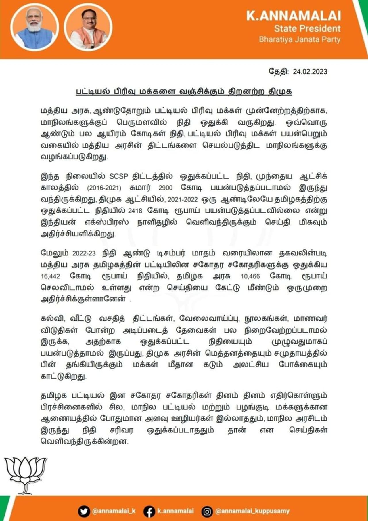 தமிழக பாஜக தலைவர் அண்ணாமலை இன்று வெளியிட்டுள்ள அறிக்கையில், “மத்திய அரசு, ஆண்டுதோறும் பட்டியல் பிரிவு மக்கள் முன்னேற்றத்திற்காக, மாநிலங்களுக்குப் பெருமளவில் நிதி ஒதுக்கி வருகிறது. ஒவ்வொரு ஆண்டும் பல ஆயிரம் கோடிகள் நிதி, பட்டியல் பிரிவு மக்கள் பயன்பெறும் வகையில் மத்திய அரசின் திட்டங்களை செயல்படுத்திட மாநிலங்களுக்கு வழங்கப்படுகிறது.