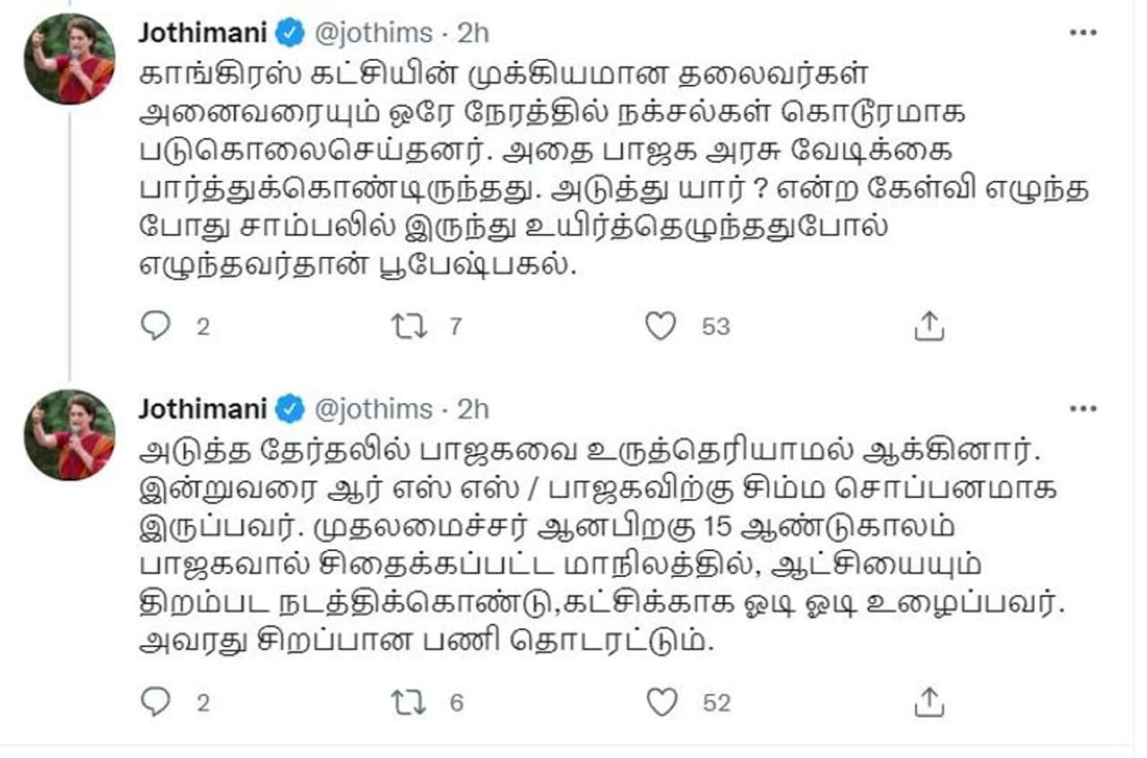இந்த முடிவுகள் பற்றி கரூர் எம்பி ஜோதிமணி தமது டுவிட்டர் பதிவில் கூறி உள்ளதாவது: