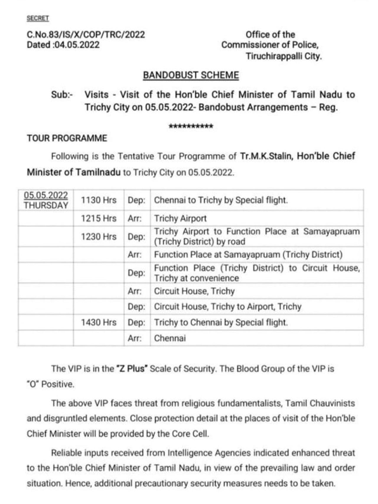 திருச்சி வரும் முதல்வர் ஸ்டாலினுக்கு மதவாதிகளால் ஆபத்து இருப்பதாக உளவுத்துறை கொடுத்தத தகவலின் அடிப்படையில் அவருக்கு பாதுகாப்பு பலப்படுத்தப்பட்டுள்ளது.