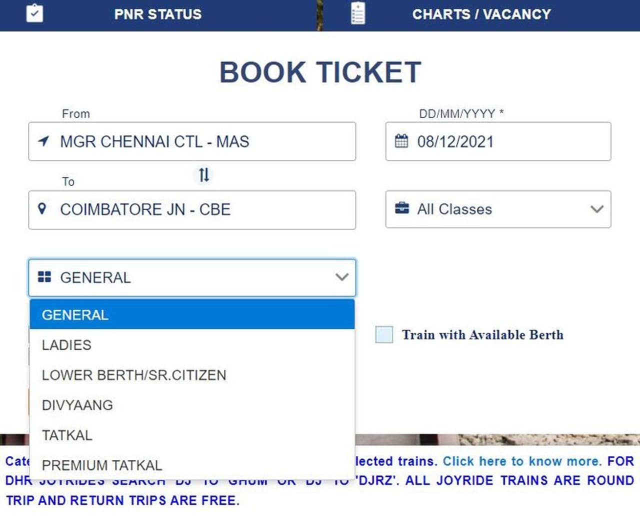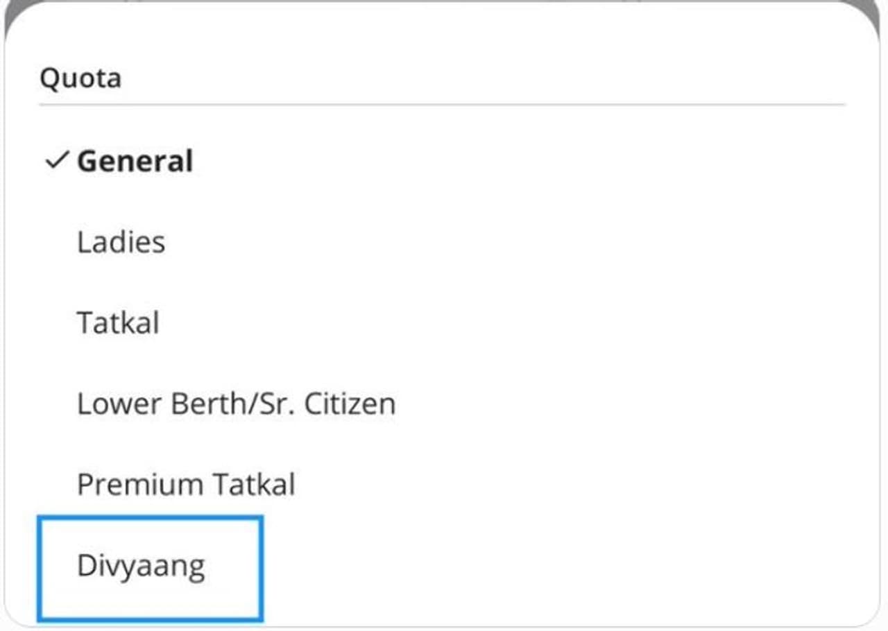 ஐஆர்சிடிசி இணைய தள முன்பதிவை நாம் கூகுள் செய்தோம் என்றால் அதில் வழக்கமாக செல்லும் ஊர்கள், தேதி, பயணிகள் யார் என விவரங்கள் கேட்கப்படும். அந்த பகுதியில் பெண்கள், கீழ் இருக்கை அல்லது மூத்தோர் இருக்கை என்பதற்கு அடுத்ததாக divyaang என்ற பிரிவு குறிப்பிடப்பட்டு உள்ளது.