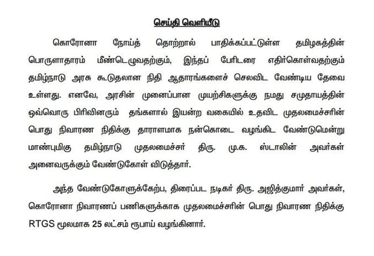 நடிகர் அஜித் கொரோனா நிவாரண நிதியாக 2 கோடியே 50 லட்சம் கொடுத்ததாக தகவல் வெளியானது. இது குறித்து வெளியான செய்திக் குறிப்பில், கொரோனா நோய் தொற்றால் பாதிக்கப்பட்டுள்ள தமிழகத்தின் பொருளாதாரம் மீண்டு எழுவதற்கும் இந்த பேரிடரை எதிர்கொள்வதற்கும், தமிழ்நாடு அரசு கூடுதல் நிதி ஆதாரங்களை செலவிட வேண்டிய தேவை உள்ளது. எனவே அரசின் முயற்சிகளுக்கு நமது சமுதாயத்தின் ஒவ்வொரு பிரிவினரும் தங்களால் இயன்ற வகையில் உதவிட முதலமைச்சரின் பொது நிவாரண நிதிக்கு தாராளமாக நன்கொடை வழங்கிட வேண்டும் என்று மாண்புமிகு தமிழ்நாடு முதலமைச்சர் மு.க.ஸ்டாலின் அவர்கள் அனைவருக்கும் வேண்டுகோள் விடுத்தார். அந்த வேண்டுகோளுக்கு ஏற்ப திரைப்பட நடிகர் அஜித் குமார் கொரோனா நிவாரணப் பணிகளுக்காக முதலமைச்சரின் பொது நிவாரண நிதிக்கு பண பரிவர்த்தனை மூலம் 2 கோடியே 50 லட்சம் ரூபாய் வழங்கினார் என்று குறிப்பிடப்பட்டிருந்தது.