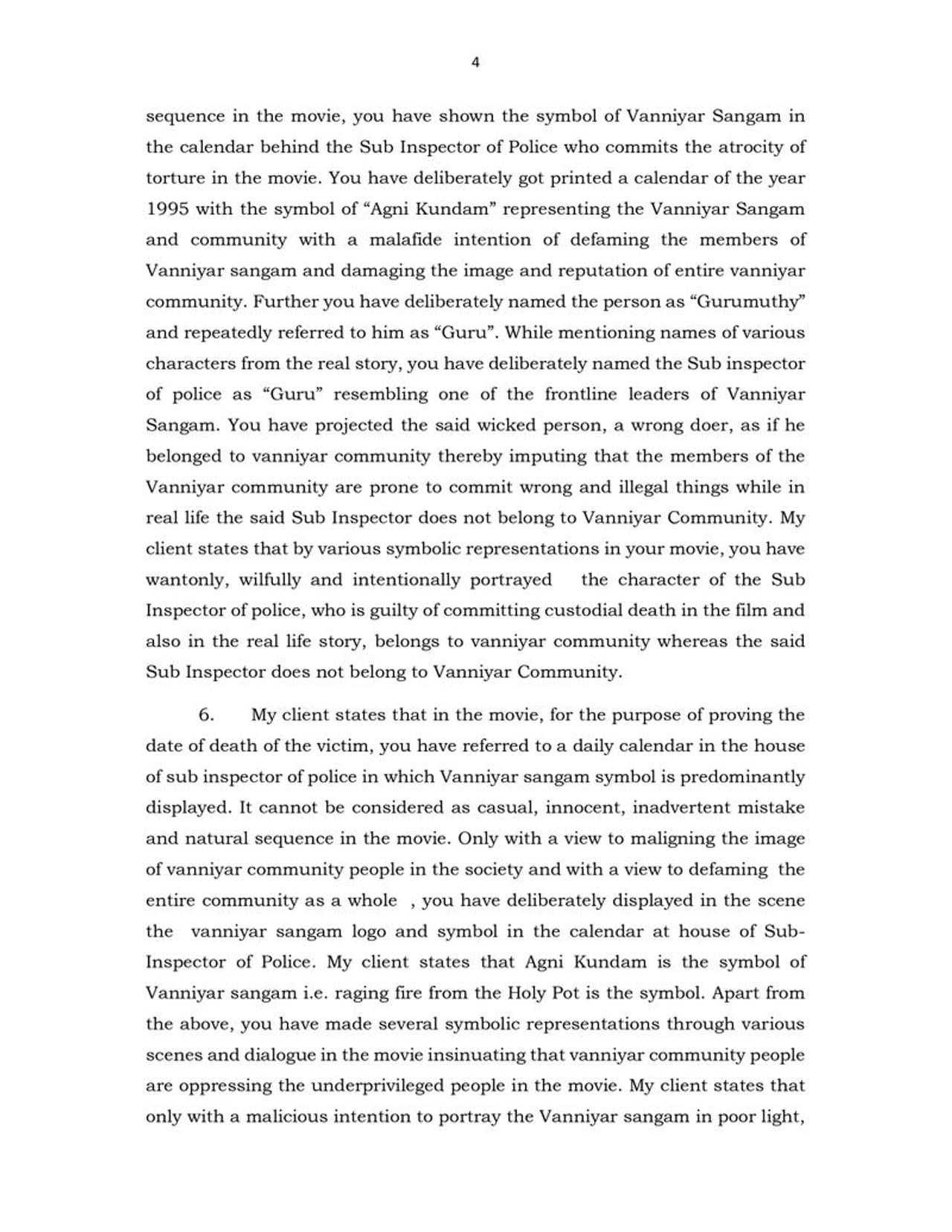 வன்னியர் சங்கத்தின் மாநில தலைவர் பு.த.அருள்மொழி சார்பாக, பாட்டாளி மக்கள் கட்சியின் செய்தித் தொடர்பாளரும், மூத்த வழக்கறிஞருமான பாலு இன்று ஒரு வக்கீல் நோட்டிஸ் அனுப்பியுள்ளார். அதில் படத்தை தயாரித்த 2டி நிறுவனம் முதல் எதிர் மனுதாரராகவும், நடிகர் தயாரிப்பாளர் சூர்யா, அவரது மனைவியும் தயாரிப்பாளருமான ஜோதிகா, இயக்குநர் த.செ.ஞானவேல், படத்தை வெளியிட்ட அமேசான் ஒடிடி தளம் ஆகியோர் அடுத்தடுத்த எதிர் மனுதாரர்களாவும் சேர்க்கப்பட்டுள்ளனர்.