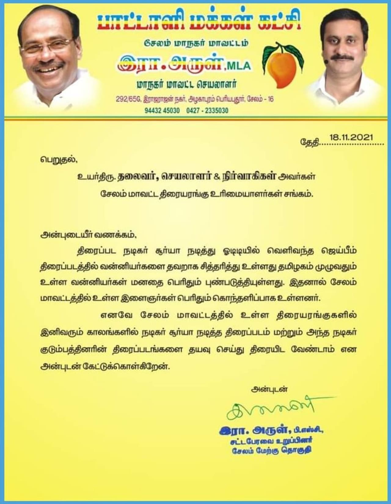 இந்நிலையில் சேலத்தில் சூர்யா மற்றும் அவருடைய குடும்பத்தினர் நடித்த படங்களை வெளியிடக் கூடாது என்று சேலம் தெற்கு பாமக எம்.எல்.ஏ. அருள், சேலம் மாவட்ட திரையரங்கு உரிமையாளர்கள் சங்கத் தலைவர், செயலாளர் மற்றும் நிர்வாகிகளுக்கு கடிதம் எழுதியுள்ளார். அதில், “திரைப்பட நடிகர் சூர்யா நடித்து ஓ.டி.டி.யில் வெளிவந்த ஜெய்பீம் திரைப்படத்தில் வன்னியர்களைத் தவறாகச் சித்திரித்து உள்ளது. இது தமிழகம் முழுவதும் உள்ள வன்னியர்கள் மனதை பெரிதும் புண்படுத்தியுள்ளது. இதனால், சேலம் மாவட்டத்தில் உள்ள இளைஞர்கள் பெரிதும் கொந்தளிப்பாக உள்ளனர்.