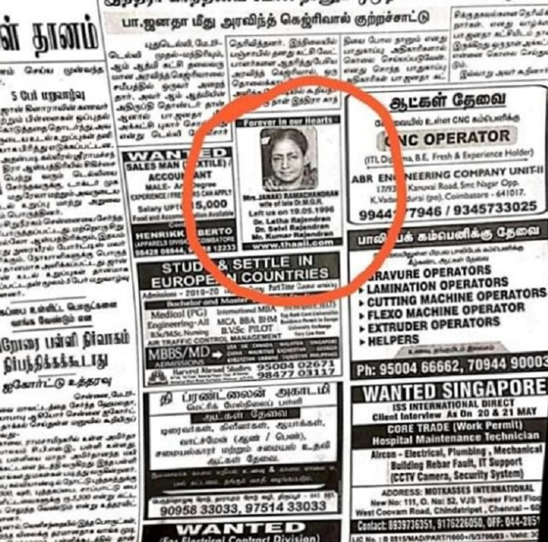 அரசியல் மற்றும் திரையுலகில் கொடி கட்டிப் பறந்த எம்ஜிஆரின் மனைவி ஜானகி ராமச்சந்திரனின் நினைவு நாளான கடந்த 19 ஆம் தேதி அவரது உறவினர்கள் மட்டும் நாளிதழ் ஒன்றில் மிகச்சிறிய அளவில் நினைவு நாள் படத்தை வெளியிட்டிருந்தனர். அதிமுக என்ற சாம்ராஜ்யத்தின் மிகப் பெரிய ஆளுமையாக இருந்த ஜானகிக்கு ஏற்பட்ட இந்த நிலையை எண்ணி அதிமுகவின் உண்மையான தொண்டர்கள் வருத்தம் அடைந்துள்ளனர்.