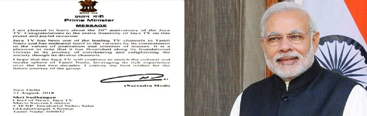 ஜெயா தொலைக்காட்சியின் 20-வது ஆண்டு தொடக்கவிழாவையொட்டி பிரதமர் நரேந்திர மோடி தெரிவித்துள்ள வாழ்த்து செய்தியில் , ஜெயா டி.வி. சிறப்பான செய்தி சேவை மூலம் மக்கள் மனதில் இடம்பெற்றிருப்பதாகவும், தமிழகத்தின் பண்பாட்டை தொடர்ந்து நிலைநாட்ட பெரிதும் பாடுபடுவதாகவும் கூறியுள்ளார்.