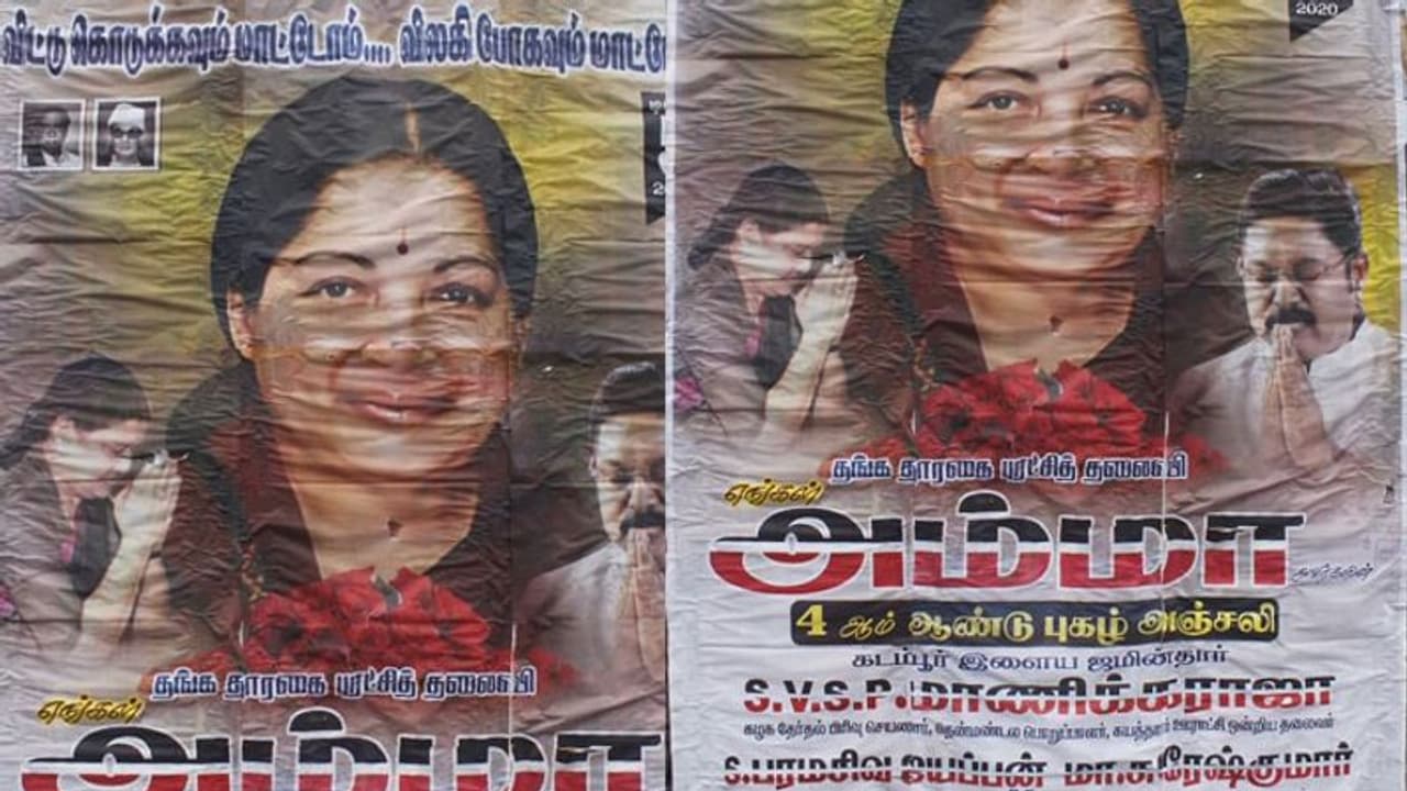 இந்நிலையில், ஜெயலலிதா நினைவு தினத்தையொட்டி அமமுக சார்பில் ஓட்டப்பட்ட போஸ்டர்கள் பெரும் சர்ச்சையை ஏற்படுத்தியுள்ளது. அந்த போஸ்டரில், `விட்டுக்கொடுக்கவும் மாட்டோம். விலகிப் போகவும் மாட்டோம் என சசிகலா, டிடிவி.தினகரன் ஆகியோர் ஜெயலலிதாவை வணங்குவது போல போஸ்டர்கள் ஒட்டப்பட்டிருந்தது. சசிகலா அடுத்த மாதம் விடுதலையாகக்கூடும் என்று கூறப்படும் நிலையில், இந்த போஸ்டரில் எழுதப்பட்டிருக்கும் வசனங்கள் பல்வேறு கேள்விகளை எழுப்பியது.