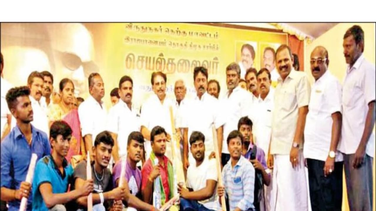அதன்படி நேற்று விளையாட்டு உபகரணங்கள் வழங்கும் விழா நடைபெற்றது. ராஜபாளையம் மற்றும் சுற்று வட்டார பகுதிகளைச் சேர்ந்த கிரிக்கெட், கைப்பந்து, கால்பந்து உள்ளிட்டவை விளையாடும் 250 அணிகளை சேர்ந்தவர்கள் இதில் பங்கேற்றனர்.