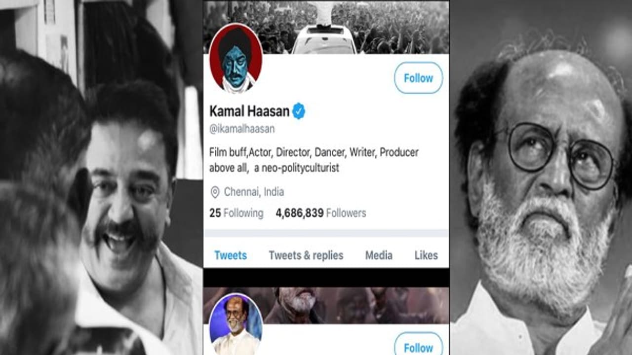 கமலை பின் தொடர்வோர் 4,686,839 பேர், ரஜினியை பின்தொடர்வோர் 4,614,947 பேர். ரஜினி ட்விட்டரில் கணக்கை தொடங்கியது February 2013 கமல் ட்விட்டரில் தொடங்கியது December 2015 இரண்டு வருடத்திற்குப் பின் கமல் இணைந்திருந்தாலும் ரஜினியை ஃபாலோ பண்ணுபவர்களின் எண்ணிக்கை விட கமலே அடித்து நொறுக்கி அதகளம் செய்து வருகிறார்.