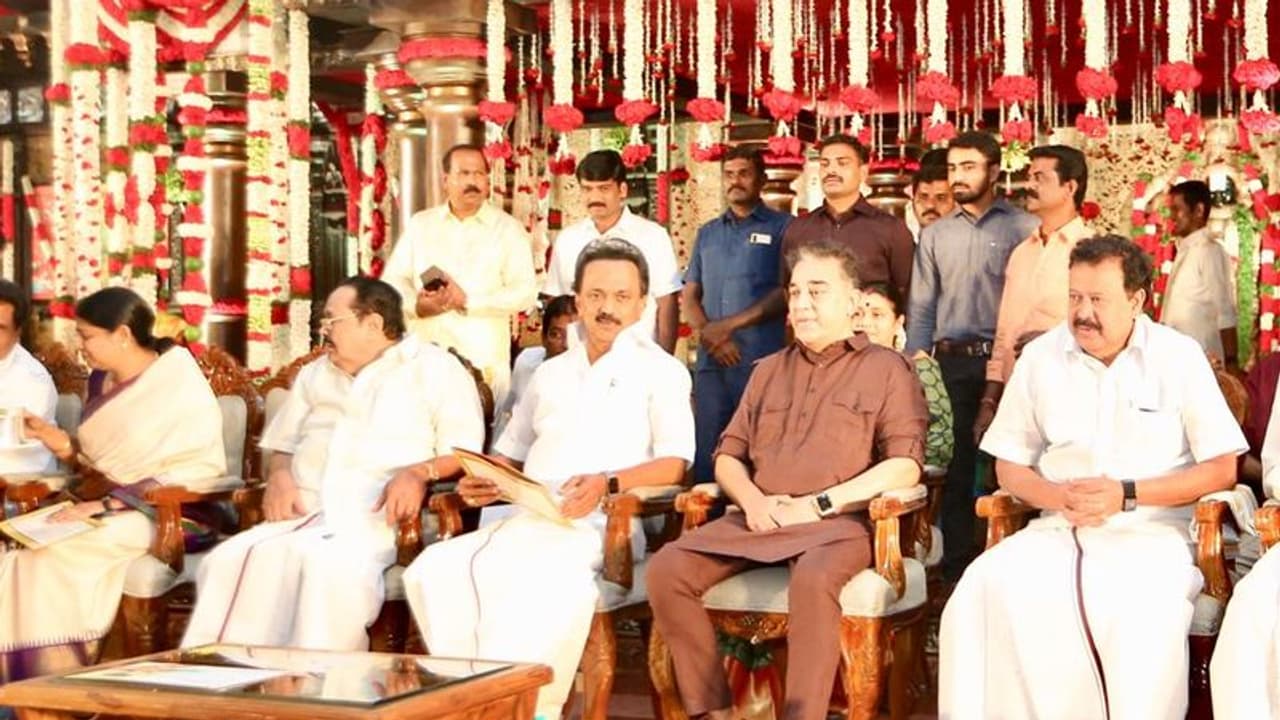 முரசொலியில் பாஜகவின் அழுத்தத்திற்காக தன்னிலை மறந்து திமுகவை விமர்சிக்கிறார் என்று கமல்ஹாசனை கடுமையாக விமர்சித்திருந்த நிலையில், திமுக எம்.எல்.ஏ இல்லத் திருமண விழாவில் ஸ்டாலினும், கமல்ஹாசனும் அருகருகே அமர்ந்து பேசிக் கொண்டிருந்தனர்.