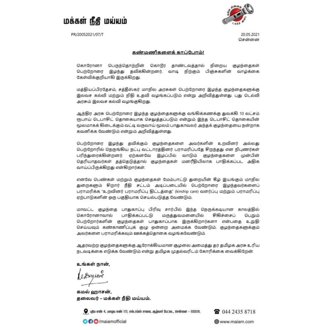 மே மாதம் 20ம் தேதி கமல் ஹாசன் அறிக்கை ஒன்றை வெளியிட்டிருந்தார். அதில் கொரோனா பெருந்தொற்றின் கொடூர தாண்டவத்தால் நிறைய குழந்தைகள் பெற்றோரை இழந்து தவிக்கின்றனர். ஆதரவற்ற குழந்தைகளுக்கு ஆரோக்கியமான சூழலை அமைத்து தர தமிழக அரசு உரிய நடவடிக்கை எடுக்க வேண்டும் என்றும், சத்தீஸ்கர், மத்தியப்பிரதேசம், ஆந்திராவைப் போல் நிவாரண உதவிக்கு ஏற்பாடு செய்ய வேண்டும் என்றும் கோரிக்கை விடுத்திருந்தார்.