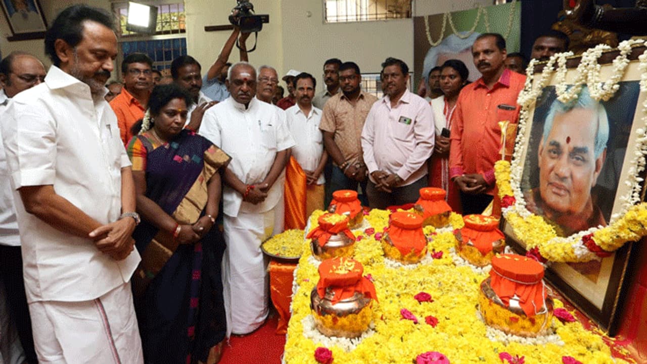 பிரசாத்தும் உடனடியாக தொலைக்காட்சி மற்றும் செய்தி நிறுவனங்களை தொடர்பு கொண்டு வாஜ்பாய் அஸ்திக்கு மரியாதை செலுத்த ஸ்டாலின் கமலாலயம் வரும் தகவலை கூறியுள்ளார். சொன்னது போலவே வியாழக்கிழமை காலை எட்டு மணி அளவில் ஸ்டாலின் கமலாலயம் வருகை தந்தார். அவரை தமிழிசை மற்றும் பொன்.ராதாகிருஷ்ணன் வரவேற்றனர். நேராக வாஜ்பாய் அஸ்திக்கு அஞ்சலி செலுத்திய ஸ்டாலின் சிறிது நேரம் அங்கு நின்று கொண்டிருந்தார்.அப்போது தமிழிசை உள்ளே சிறிது நேரம் அமரலாமே என்று கேட்டுள்ளார். அதற்கு சட்டென்று சரியனெ கூறிய ஸ்டாலின் உள்ளே சென்று தமிழிசை மற்றும் பொன்.ராதாகிருஷ்ணனுடன் சுமார் 10 நிமிடங்கள் பேசியுள்ளார். அப்போது தி.மு.க தலைவராகப்போகும் ஸ்டாலினுக்கு தமிழிசை, பொன் ஆர் உள்ளிட்டோர் வாழ்த்து கூறியுள்ளனர். டெல்லி சென்று வாஜ்பாய் உடலுக்கே ஸ்டாலின் நேரடியாக அஞ்சலி செலுத்தினார்.