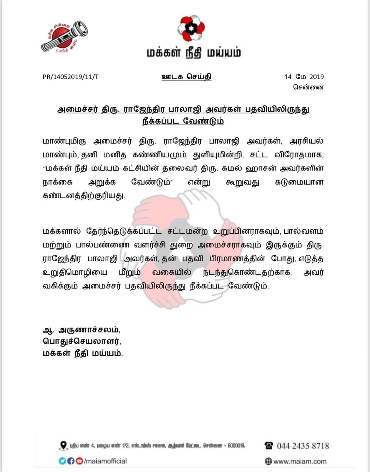 மக்களால் தேர்ந்தெடுக்கப்பட்ட சட்டமன்ற உறுப்பினராகவும் பால்வளம் மற்றும் பால்பண்ணை வளர்ச்சி துறை அமைச்சராகவும் இருக்கும் ராஜேந்திரபாலாஜி அவர்கள் தன் பதவி பிரமாணத்தின் போது, எடுத்த உறுதிமொழியை மீறும் வகையில் நடந்துகொண்டதற்காக அவர் வகிக்கும் அமைச்சர் பதவியிலிருந்து நீக்கப்பட வேண்டும் என மக்கள் நீதி மய்யம் கட்சியின் பொதுச்செயலாளர் அருணாச்சலம் கேட்டுக்கொண்டுள்ளார்.