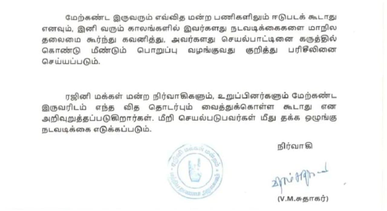 "இருவரும் எவ்வித மன்ற பணிகளிலும் ஈடுபடக் கூடாது எனவும், இனி வரும் காலங்களில் இவர்களது நடவடிக்கைகளை மாநிலத் தலைமை கூர்ந்து கவனித்து, அவர்களது செயல்பாட்டினை கருத்தில்கொண்டு மீண்டும் பொறுப்பு வழங்குவது குறித்து பரிசீலினை செய்யப்படும். ரஜினி மக்கள் மன்ற நிர்வாகிகளும், உறுப்பினர்களும் மேற்கண்டஇருவரிடம் எந்த வித தொடர்பும் வைத்துக்கொள்ள கூடாது என அறிவுறுத்தப்படுகிறார்கள். மீறி செயல்படுபவர்கள் மீது தக்க ஒழுங்கு நடவடிக்கை எடுக்கப்படும்” என்று தெரிவிக்கப்பட்டுள்ளது.