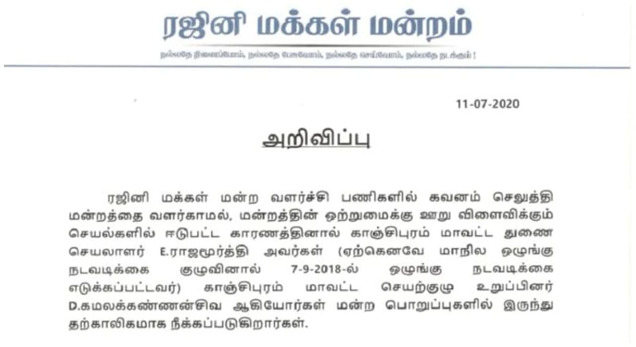 இந்நிலையில் காஞ்சிபுரம் மாவட்ட துணைசெயலாளர், செயற்குழு உறுப்பினர் ஆகியோரை ரஜினி மன்றத்திலிருந்து நீக்கி அறிக்கை வெளியிடப்பட்டுள்ளது. இதுதொடர்பாக மன்ற மாநில நிர்வாகி சுதாகர் வெளியிட்டுள்ள அறிக்கையில், “ரஜினி மக்கள் மன்ற வளர்ச்சி பணிகளில் கவனம் செலுத்தி மன்றத்தை வளர்க்காமல், மன்றத்தின் ஒற்றுமைக்கு ஊறு விளைவிக்கும் செயல்களில் ஈடுபட்ட காரணத்தினால் காஞ்சிபுரம் மாவட்ட துணைசெயலாளர் இ.ராஜமூர்த்தி (ஏற்கெனவே மாநில ஒழுங்கு நடவடிக்கை குழுவினால் 7-9-2018-ல் ஒழுங்கு நடவடிக்கை எடுக்கப்பட்டவர்) காஞ்சிபுரம் மாவட்ட செயற்குழு உறுப்பினர் டி.கமலக்கண்ணன் சிவ ஆகியோர்கள் மன்ற பொறுப்புகளில் இருந்து தற்காலிகமாக நீக்கப்படுகிறார்கள்.