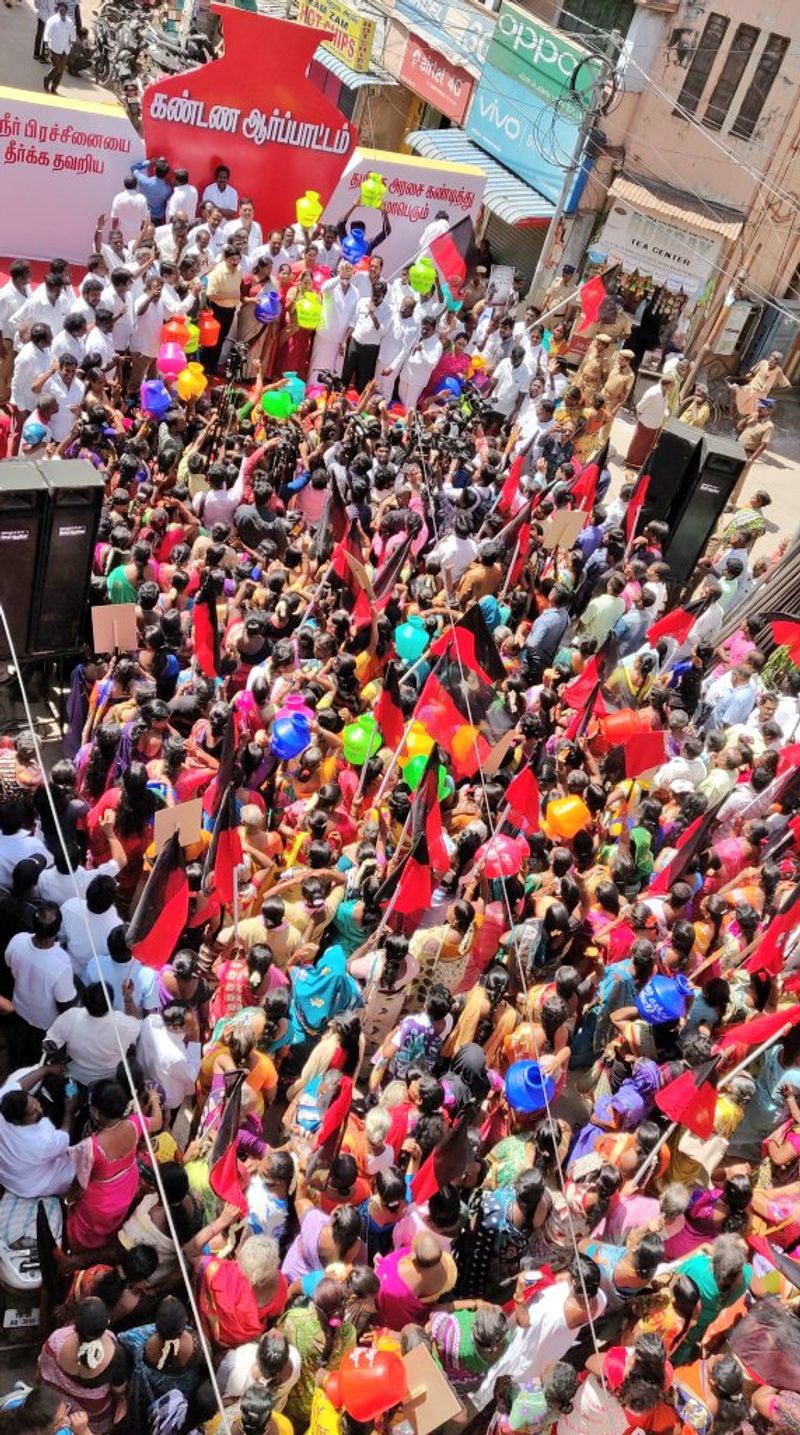 சென்னை துறைமுகம் பகுதியில் நடந்து வரும் இந்த ஆர்ப்பாட்டத்தில் கனிமொழி மத்திய சென்னை நாடாளுமன்ற உறுப்பினர் திரு தயாநிதி மாறன், மாவட்டச் செயலாளர் திரு பி கே சேகர்பாபு, எம்.எல்.ஏ. திரு ப. ரங்கநாதன்,எம்.எல்.ஏ மற்றும் தொண்டர்கள் திரளாக கலந்துகொண்டு உள்ளனர்.