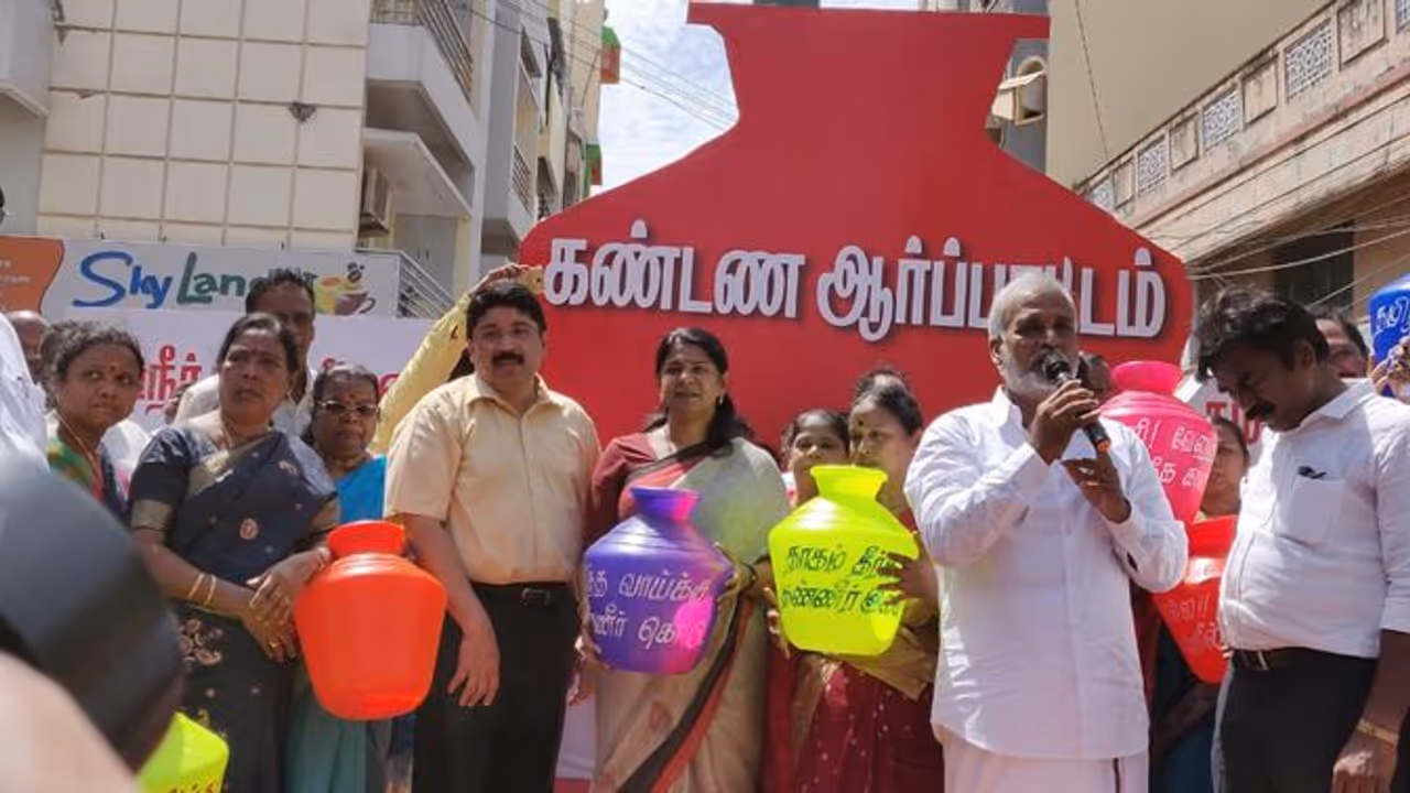 உச்சி வெயிலில் தண்ணீர் பிரச்சனைக்காக கனிமொழி மேற்கொண்ட போராட்டத்தில, வாசகம் அடங்கிய காலி குடத்தினை கையில் வைத்தவாறு முழக்கங்களை எழுப்பினார் கனிமொழி