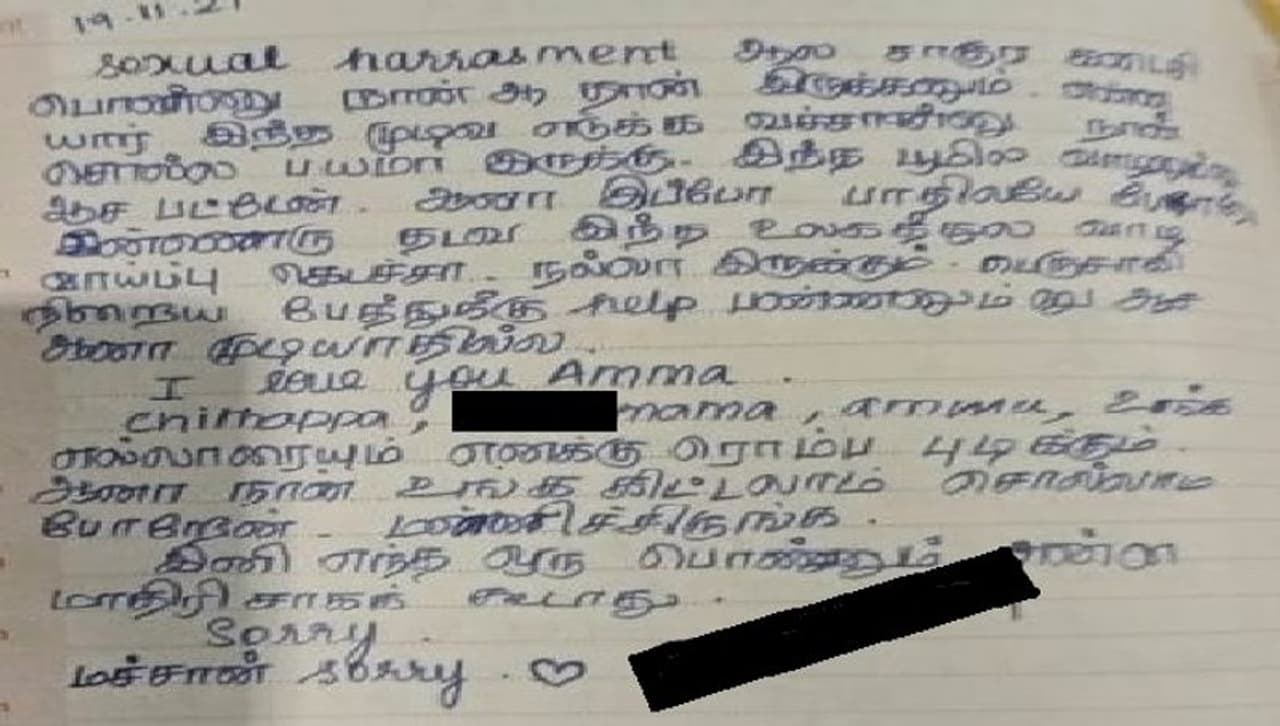 மாணவி எழுதிய அந்தக் கடிதத்தில், பாலியல் தொல்லையால் சாகுர கடைசி பொண்ணு நானாக தான் இருக்கணும். என்ன யார் இந்த முடிவு எடுக்க வெச்சான்னு நான் சொல்ல பயமா இருக்கு, இந்த பூமியில் வாழரதுக்கு ஆசைப்பட்டேன், ஆனா, இப்போ பாதியிலேயே போரேன். இன்னொரு தடவ இந்த உலகத்துல வாழ வாய்ப்பு கிடைச்சா நல்லா இருக்கும். பெரிதாகி நிறைய பேருக்கு உதவி பன்ன ஆசை ஆனா முடியல. ஐ லவ் அம்மா, சித்தப்பா, மாமா, அம்மு உங்க எல்லோரையும் ரொம்ப பிடிக்கும், ஆனா நான் உங்கிட்ட எல்லாம் சொல்லாம போகிறேன். மன்னிச்சுருங்க என்றும், இனி எந்த ஒரு பொண்ணும் என்ன மாதிரி சாகக் கூடாது என்றும், சாரி மச்சான் சாரி என குறிப்பிட்டிருக்கிறார். இந்த கடிதம் அனை அவரையும் சோகத்தில் ஆழ்த்தியது. இந்த நிலையில் குழந்தைகள் தங்கள் மீது நிகழ்த்தப்படும் பாலியல் வன்முறையை எதிர்க்கவும், எந்த ஒரு அச்ச உணர்வுமின்றி அதுகுறித்த புகாரை வெளியே சொல்வதற்குமான பாதுகாப்பான சூழலை ஏற்படுத்தித் தர வேண்டும் என திமுக எம்.பி. கனிமொழி தெரிவித்துள்ளார்.