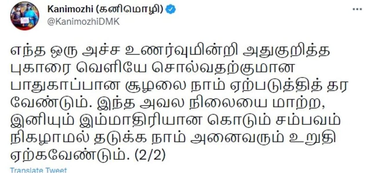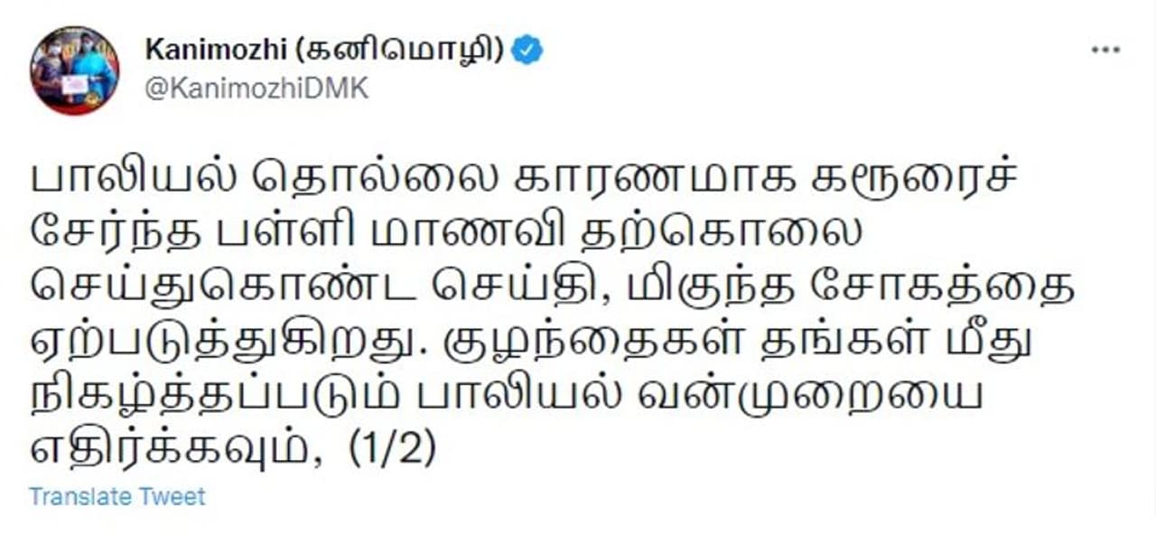 குழந்தைகள் தங்கள் மீது நிகழ்த்தப்படும் பாலியல் வன்முறையை எதிர்க்கவும், எந்த ஒரு அச்ச உணர்வுமின்றி அதுகுறித்த புகாரை வெளியே சொல்வதற்குமான பாதுகாப்பான சூழலை ஏற்படுத்தித் தர வேண்டும் என திமுக எம்.பி. கனிமொழி தெரிவித்துள்ளார். கோவையில் தனியார் பள்ளியில் 12 ஆம் வகுப்பு படித்து வந்த மாணவிக்கு அதே பள்ளியை சேர்ந்த ஆசிரியர் ஒருவர் தொடர்ந்து பாலியல் தொல்லை கொடுத்து வந்ததால் மன உளைச்சலுக்கு ஆளான மாணவி தூக்கிட்டு தற்கொலை செய்துக்கொண்டார். இந்த சம்பவம் பெரும் அதிர்வலைகளை ஏற்படுத்தியது. அதன் தாக்கல் குறைவதற்குள் மேலும், ஒரு அதிர்ச்சி சம்பவமாக, கரூரில் 12 ஆம் வகுப்பு மாணவி ஒருவர் பாலியல் தொல்லையால் உயிரிழக்கும் கடைசி பெண் நானாக தான் இருக்க வேண்டும் என கடிதம் எழுதி வைத்துவிட்டு தற்கொலை செய்துக்கொண்டார். இந்த சம்பவம் பெரும் அதிர்ச்சியை ஏற்படுத்தியுள்ளது.