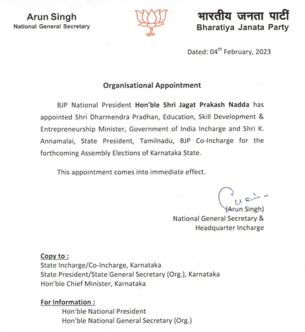 இந்நிலையில் கர்நாடகா மாநிலத்தில் நடைபெறும் தேர்தலுக்கான பொறுப்பாளர்களை பாஜக தலைமை இன்று அறிவித்துள்ளது. இதுதொடர்பாக பாஜகவின் பொதுச்செயலாளர் அருண் சிங் வெளியிட்டுள்ள செய்தி குறிப்பில்;- மத்திய கல்வி மற்றும் திறன் மேம்பாட்டுத்துறை அமைச்சர் தர்மேந்திர பிரதான் கர்நாடகா மாநில சட்டப்பேரவை தேர்தலுக்காக பொறுப்பாளராகவும், தமிழக பாஜக தலைவர் அண்ணாமலை இணைப் பொறுப்பாளராகவும் நியமிக்கப்பட்டுள்ளனர்.