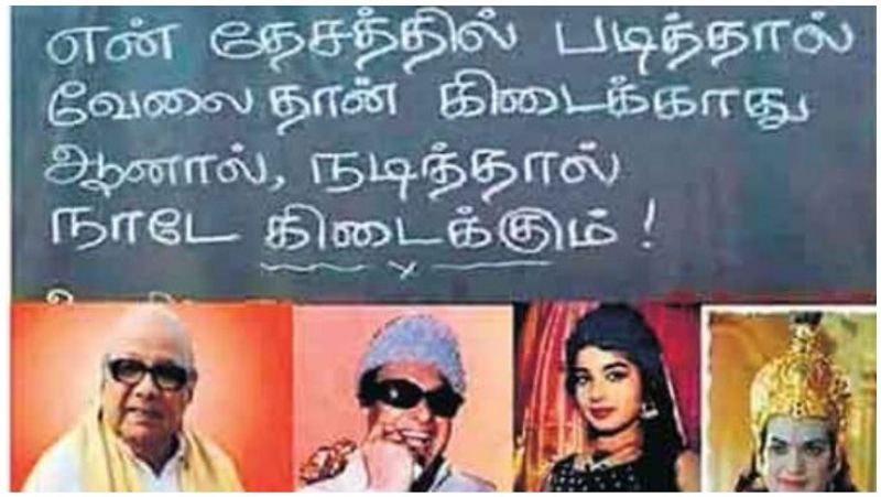 2014 ம் ஆண்டு மக்களவை தேர்தலில், திமுக, அதிமுக, பாஜக வை எதிர்த்து, காங்கிரஸ் சார்பில், தனித்து போட்டியிட்டு, டெபாசிட் இழந்தார் கார்த்தி சிதம்பரம். தேர்தலுக்கு முன்னும், பின்னும், திராவிட கட்சிகளை, அதிகம் விமர்சித்து பேசியும், சமூக ஊடகங்களில் எழுதியும் வந்தார். அப்போது கார்த்தி தனது ட்விட்டர் பக்கத்தில் பதிவிட்ட ஒன்று, தற்போது வாட்ஸ் ஆப்பில், பரவி வருகிறது. அதில், கருணாநிதி, எம்.ஜி.ஆர்., - ஜெயலலிதா, என்.டி.ராமாராவ் ஆகியோர் படங்களை போட்டு, 'என் தேசத்தில் படித்தால் வேலை தான் கிடைக்காது.