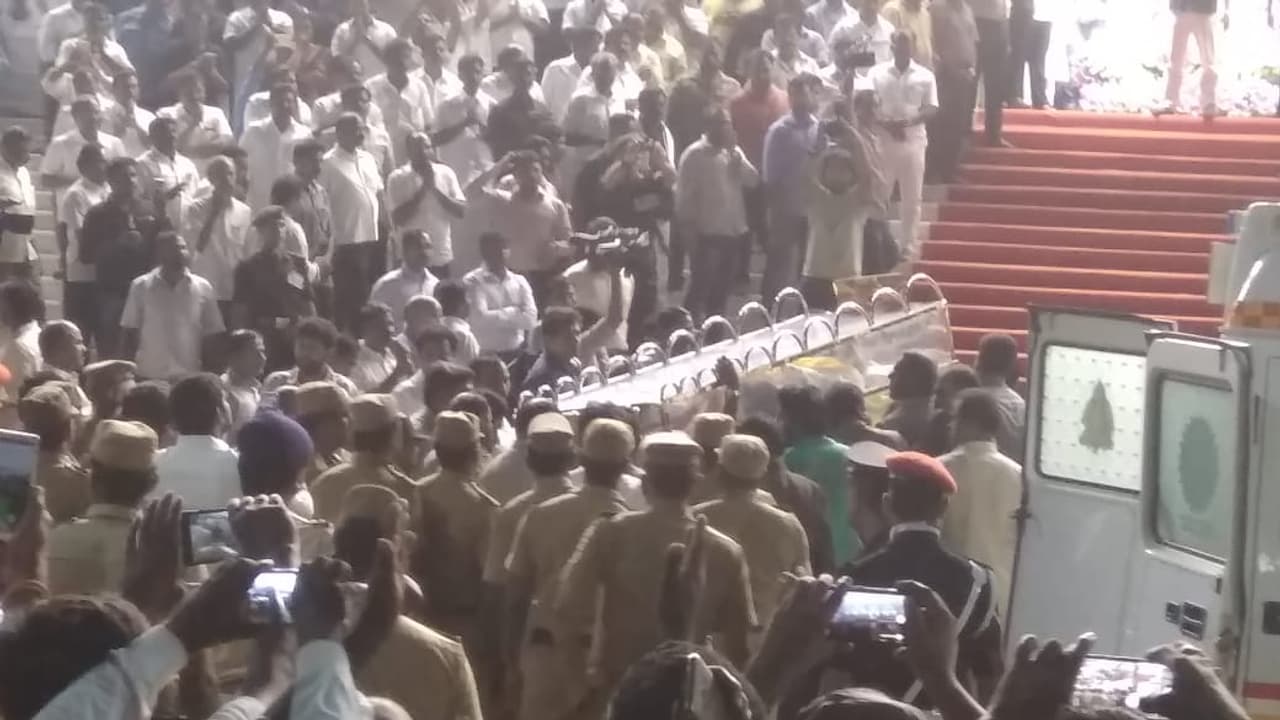 சென்னை சிஐடி நகர் இல்லத்தில் இருந்து திமுக தலைவர் கருணாநிதியின் உடல் ஓமந்தூரார் தோட்டத்தில் உள்ள ராஜாஜி அரங்கிற்கு கொண்டு வரப்பட்டுள்ளது.