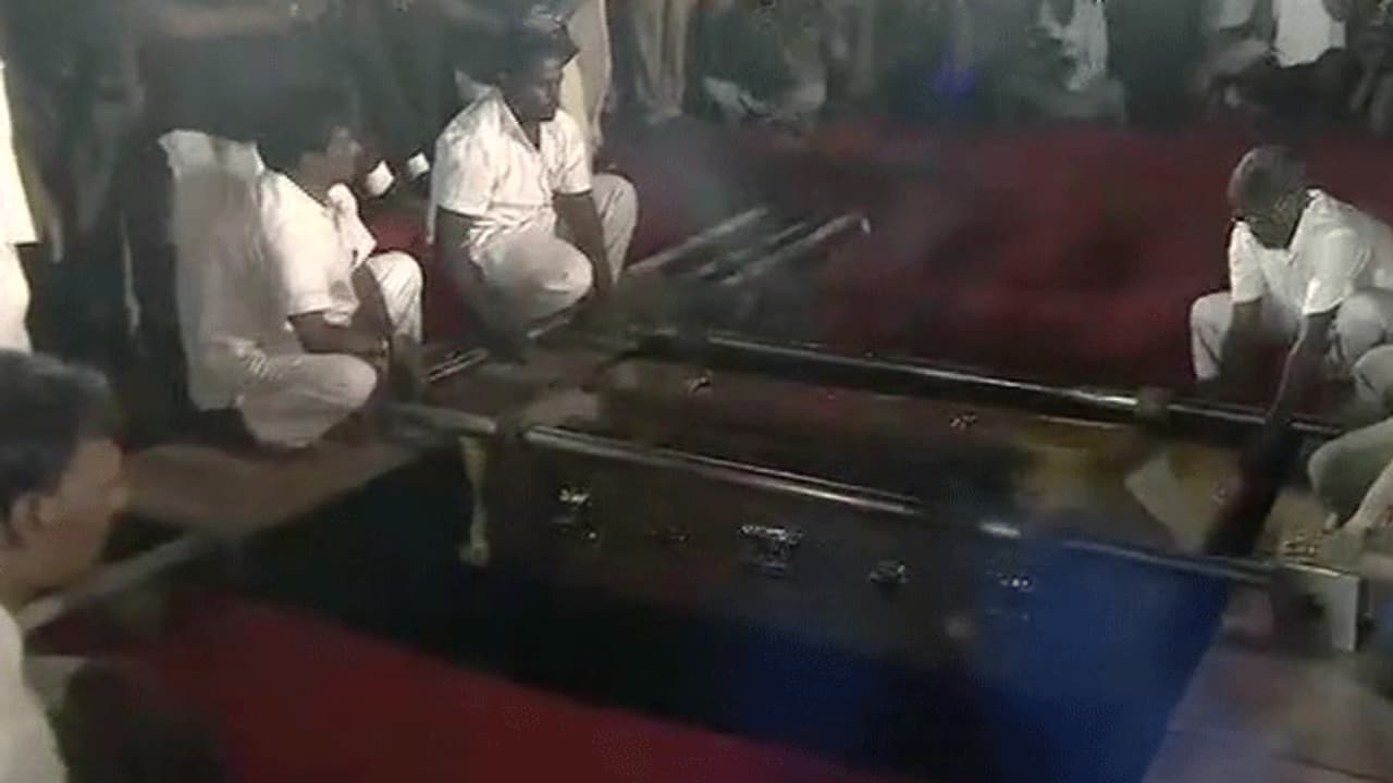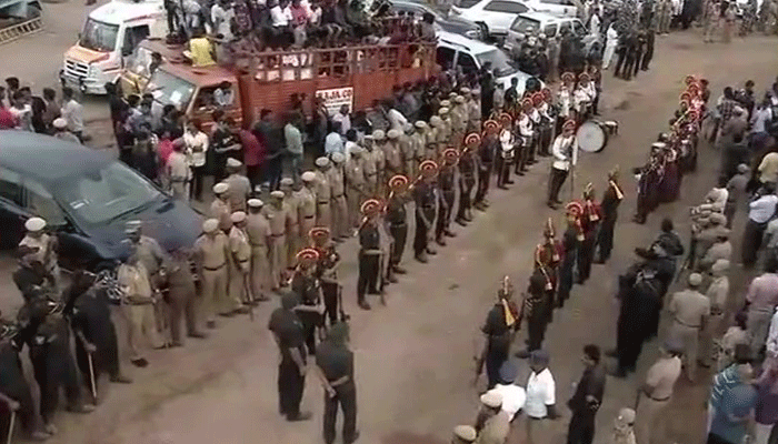 இதனையடுத்து அங்கு பிரதமர் மோடி, ராகுல்காந்தி உள்ளிட்ட அரசியல் கட்சி தலைவர்கள், திரையுலகினர் மற்றும் லட்சக்கணக்கான தொண்டர்கள் அஞ்சலி செலுத்தினர். பிறகு ஊர்வலமாக எடுத்து செல்லப்பட்டு 21 குண்டுகள் முழங்க சென்னை மெரினாவில் உள்ள அண்ணா சமாதி பக்கத்தில் அவரதுஉடல் நல்லடக்கம் செய்யப்பட்டுள்ளது.