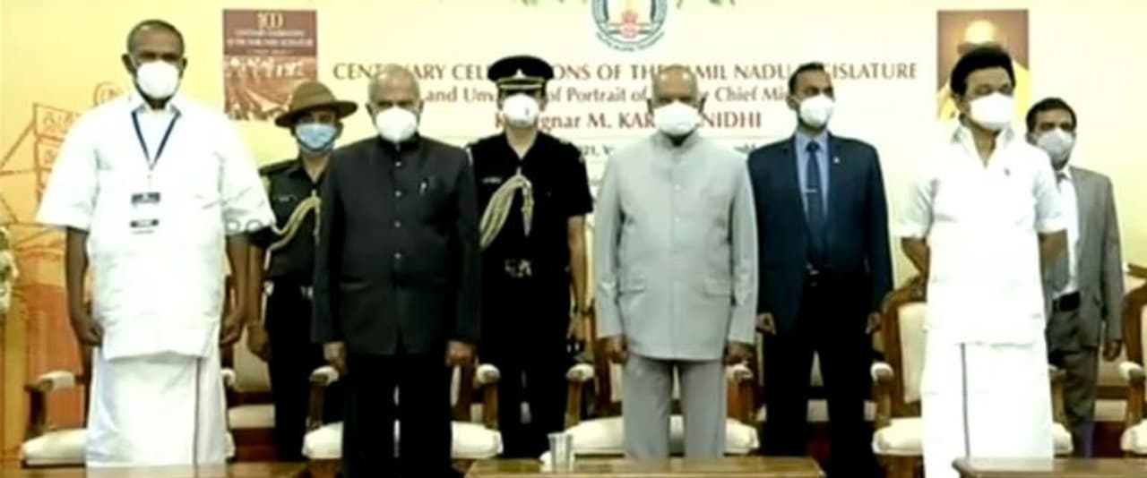 தமிழக சட்டமன்ற நூற்றாண்டு விழாவையொட்டி, முன்னாள் முதல்வர் கருணாநிதியின் திருவுருவப் படத்திறப்புவிழா இன்று நடைபெற்றது. இவ்விழாவில் குடியரசுத் தலைவர் ராம்நாத் கோவிந்த் கலந்துகொண்டு கருணாநிதியின் திருவுருவப் படத்தைத் திறந்து வைத்தார்.