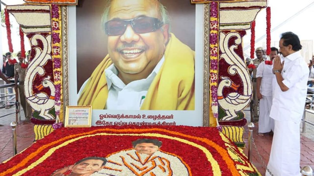 திமுக முன்னாள் தலைவர் மறைந்து 100 நாட்கள் ஆன நிலையில் அவரது நினைவிடத்தில் திமுக தலைவர் மு.க.ஸ்டாலின் மரியாதை செலுத்தினார்.