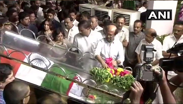 பிரதமர் மோடி, குடியரசுத் தலைவர் ராம்நாத், காங்கிரஸ் தலைவர் ராகுல் என பலரும் இரங்கல் தெரிவித்த நிலையிலும் ரஜினியின் இரங்கல் தான் தொலைக்காட்சிகள் மற்றும் சமூக ஊடகங்களில் வைரலாகிக் கொண்டிருந்தது. இந்த நிலையில் கலைஞரின் உடல் இரவு 9 மணி முதல் குடும்பத்தினர் அஞ்சலிக்காக கோபாலபுரத்தில் வைக்கப்படும் என்று தி.மு.க சார்பில் அறிவிப்பு வெளியானது. ஆனால் கலைஞர் உடல் ஒன்பது மணிக்கு பிறகே கோபாலபுரம் இல்லத்திற்கு வந்தது. குடும்பத்தினர் மட்டுமே அஞ்சலி செலுத்த அனுமதி என்று அறிவிக்கப்பட்ட நிலையில் வைகோ, திருமாவளவன், மம்தா பானர்ஜி போன்ற அரசியல் தலைவர்களும் கலைஞரின் கோபாலபுரம் இல்லத்திற்கு படையெடுத்தனர். மேலும் ஆயிரக்கணக்கான தொண்டர்களும் அங்கு திரண்டனர்.