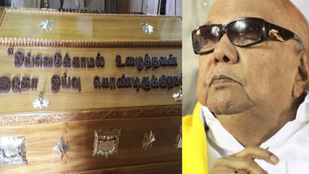 கருணாநிதி அடக்கம் செய்யப்பட உள்ள சந்தனப்பேழையில், கருணாநிதியின் ஆசைப்படி எழுதப்பட்டுள்ளது.