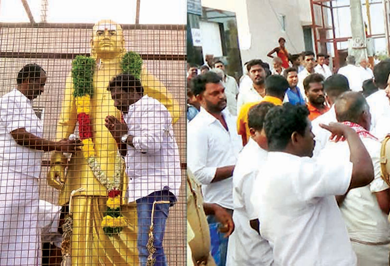 அங்குள்ள சிலை ஒன்றுக்கு மாலை அணிவிக்க சென்ற கருணாசுக்கு செருப்பு வீசி மரியாதை கொடுக்கப்பட்டது.