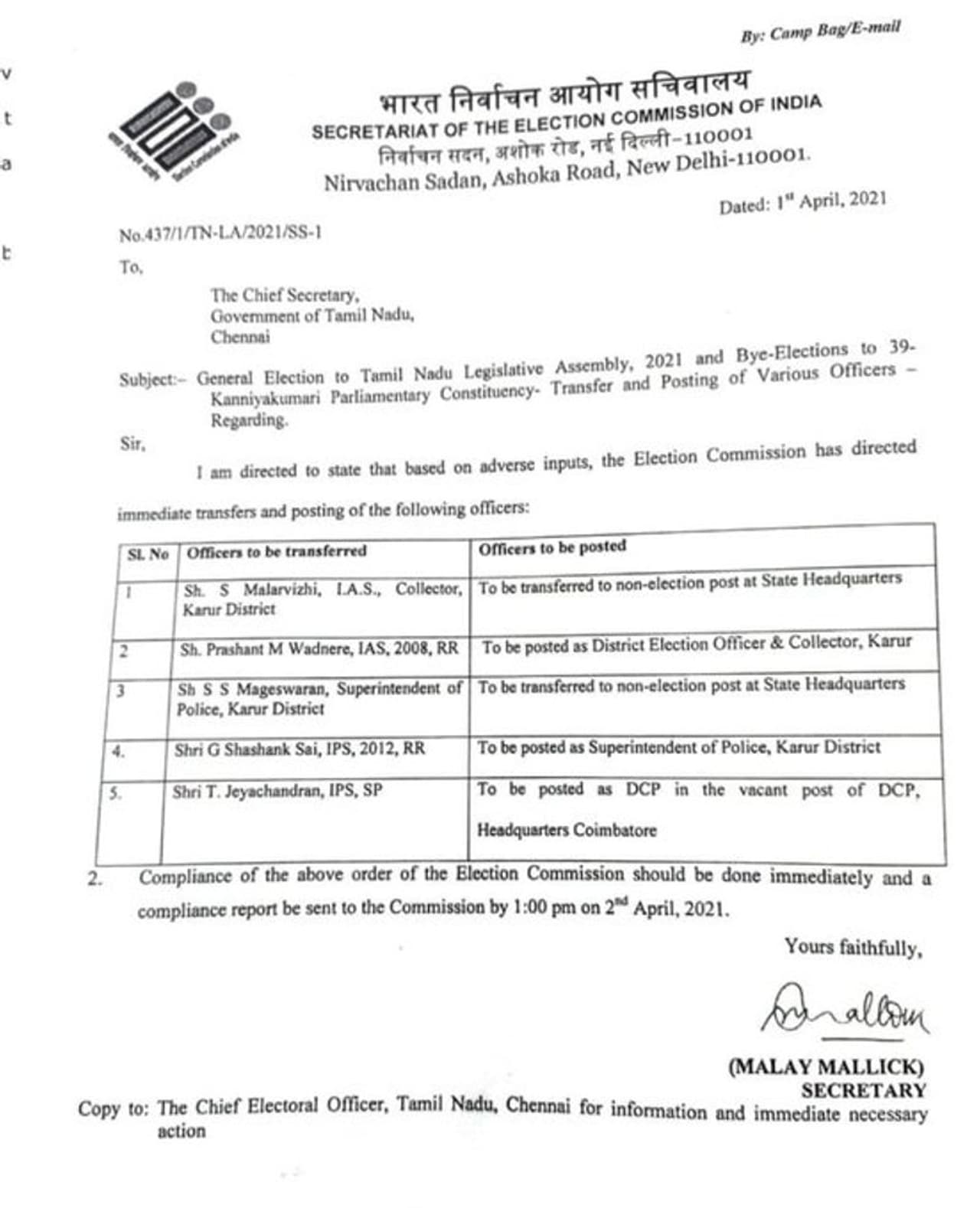 தேர்தல் ஆணையம், கரூர் மாவட்ட ஆட்சியர், காவல் கண்காணிப்பாளர் ஆகிய இருவரையும் இடமாற்றம் செய்து உத்தரவிட்டது.