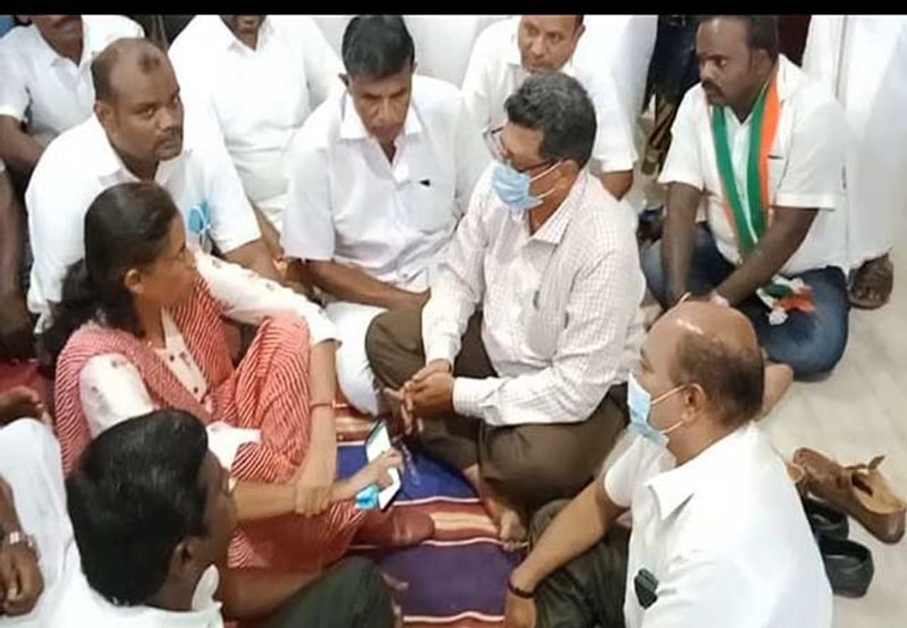 கரூர் மாவட்ட ஆட்சியர் அலுவலகத்தில் இரண்டாவது நாளாக இன்று தரையில் அமர்ந்து தர்ணா போராட்டத்தில் ஈடுபட்ட மக்களவை உறுப்பினர் ஜோதிமணியை நேரில் சந்தித்த மாவட்ட வருவாய் அலுவலர் லியாகத், அவரிடம் மாற்றுத்திறனாளிகளுக்கு உபகரணங்கள் வழங்க விரைவில் முகாம் நடக்கும் என உறுதி தந்தார். இதையடுத்து, இரண்டாவது நாளாக நடத்திய தர்ணா போராட்டத்தை ஜோதிமணி எம்.பி. வாபஸ் பெற்றுக்கொண்டார்