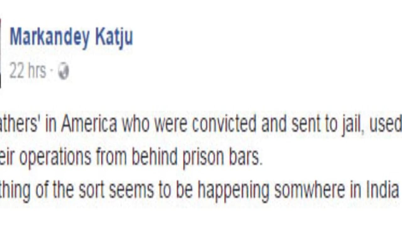 அமெரிக்காவில், சிறை தண்டனை விதிக்கப்பட்டு, ஜெயிலுக்கு அனுப்பப்படும், 'காட் பாதர்'கள் அங்கிருந்தே, தங்களது வேலைகளை செய்வது வழக்கம். அதேபோன்ற ஒரு விஷயம், தற்போது இந்தியாவிலும் எங்கேயோ நடந்து வருவது போல தோன்றுகிறது. என கட்ஜு தனது டுவிட்டர் பக்கத்தில் குறிப்பிட்டுள்ளார்.ங
