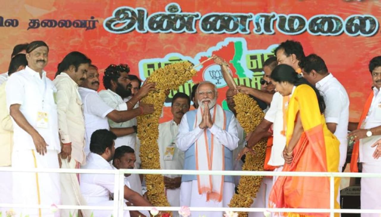 இன்று பல்லடம் அருகே உள்ள மாதப்பூரில் பாஜக பொதுக்கூட்டம் நடைபெற்றது. இதில் கலந்து கொண்டு பேசிய பிரதமர் நரேந்திர மோடி, “என்னை மிகவும் கவர்ந்த மொழி தமிழ். தமிழகத்திலிருந்து கொண்டு வரப்பட்ட செங்கோல், நாடாளுமன்றத்தில் நிறுவப்பட்டுள்ளது. வாரணாசியில் காசி தமிழ் சங்கம் நடைபெற்றது.