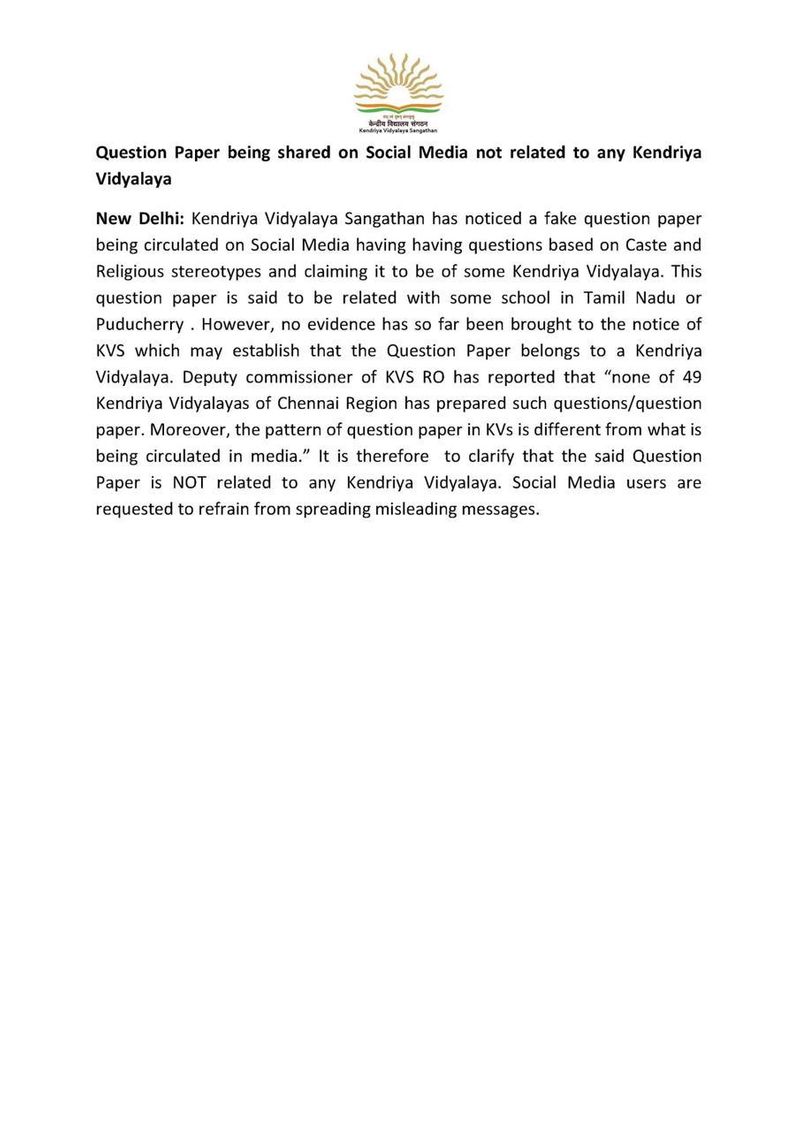 இதுதொடர்பாக சென்னையில் உள்ள கேந்த்ரியா வித்யாலயா நிர்வாகம் சார்பில் வெளியிட்டுள்ள அறிக்கையில் , முஸ்லீம்கள் குறித்தும் பட்டியல் இனத்தவர் குறித்தும் கேந்திரிய வித்யாலயா பள்ளி கேள்வித்தாளில் தவறாக சித்தரித்துள்ளதாக சமூக வலைத்தளங்களில் பரவும் செய்தி உண்மையில்லை என தெரிவிக்கப்பட்டுள்ளது.